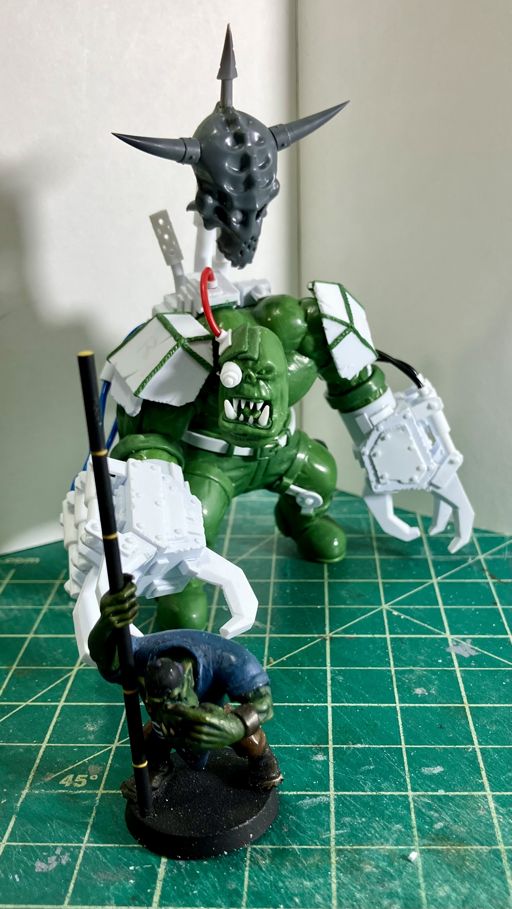 I decided I wanted to redo my Warboss, so I sculpted up a new one. I think he may have gotten into the steroid jar. Some pics with Barry (a normal sized boy)