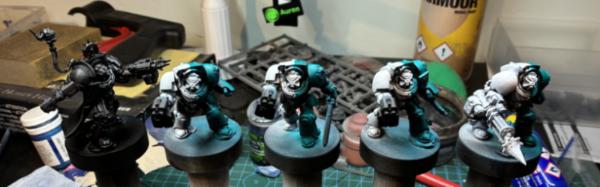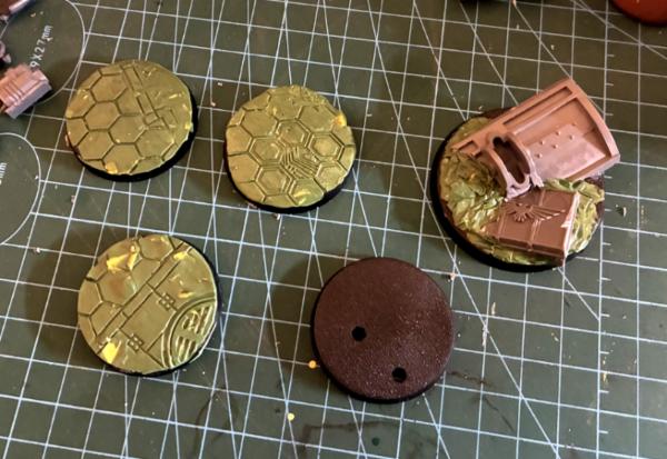 Progress! Got the blue sides done of the main squad, and the captain primed. 4 of the 5 bases also have their toppers sorted. My GS is the nastiest I’ve ever used. The yellow sides done has partly cured so indeed to pick hardened chunks of yellow out of the mixed material, so the base toppers are a bit grungy, but they will mostly be black anyway.