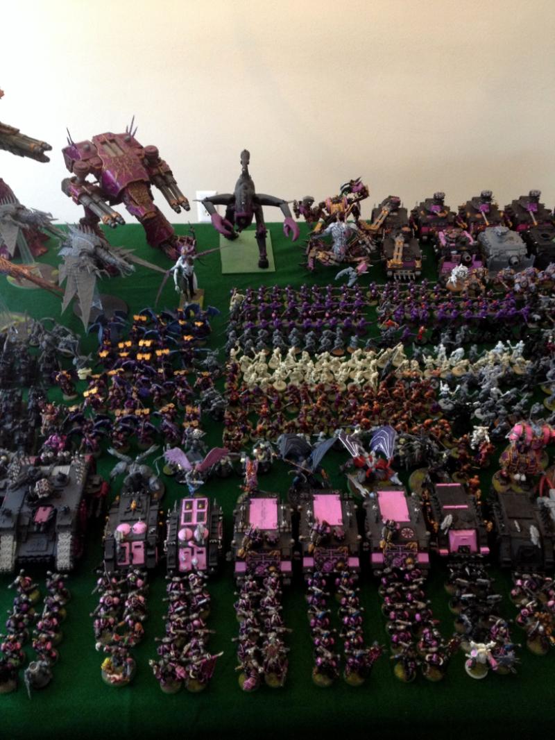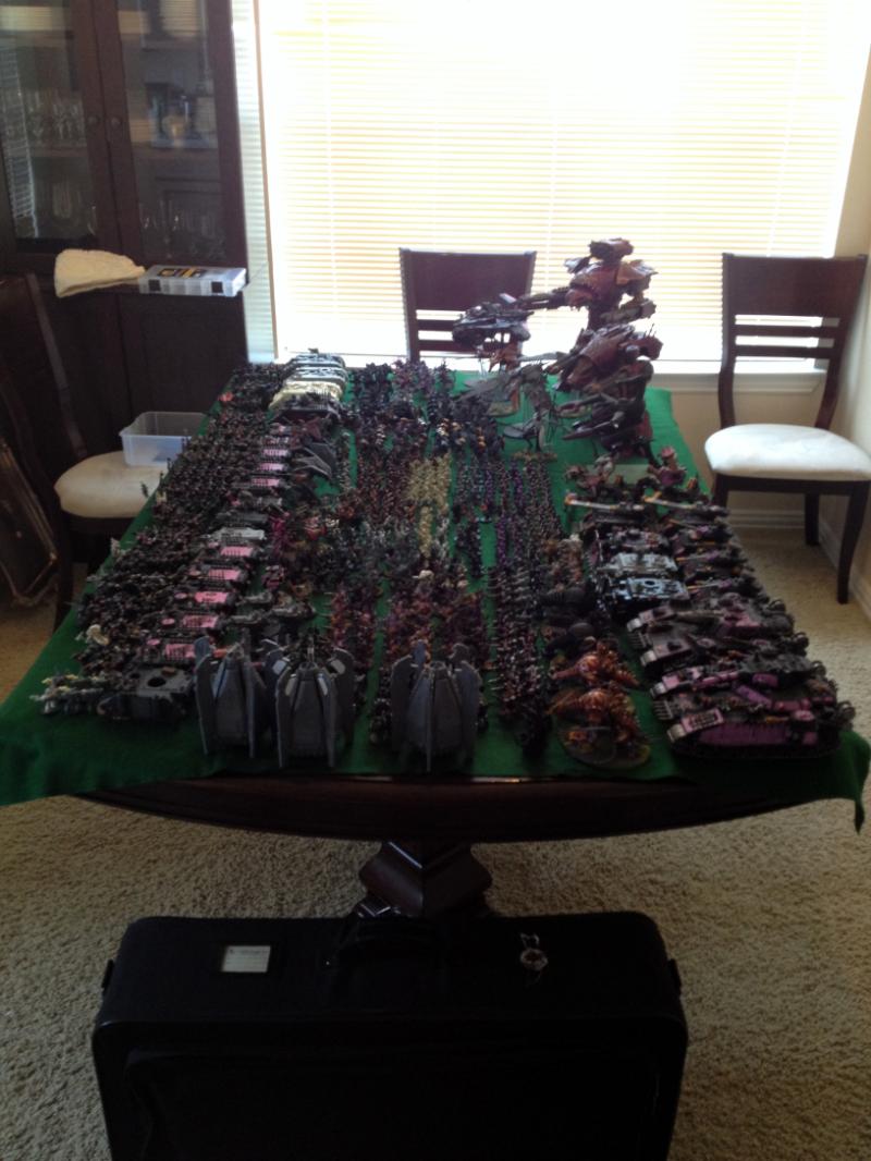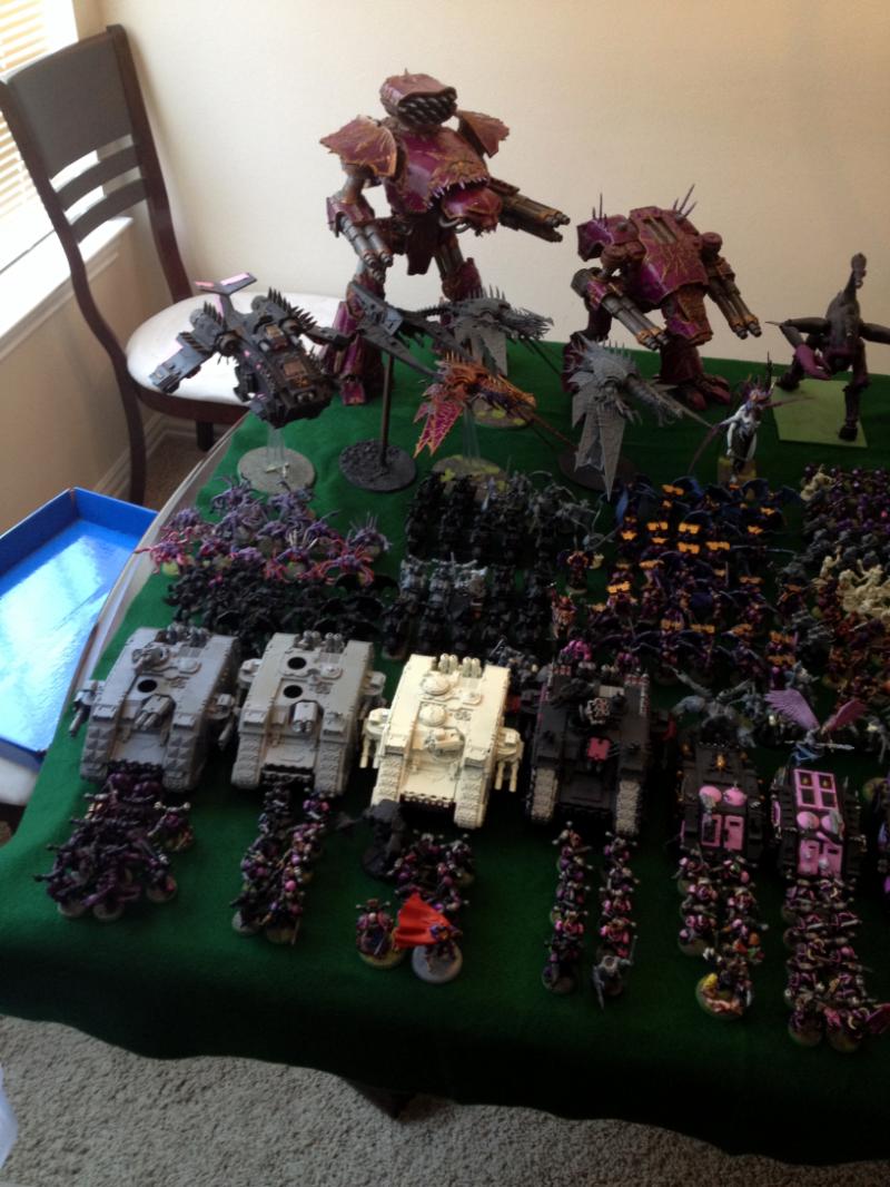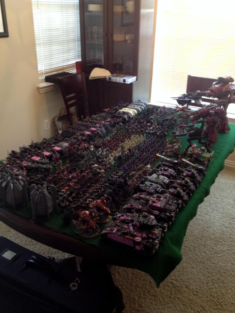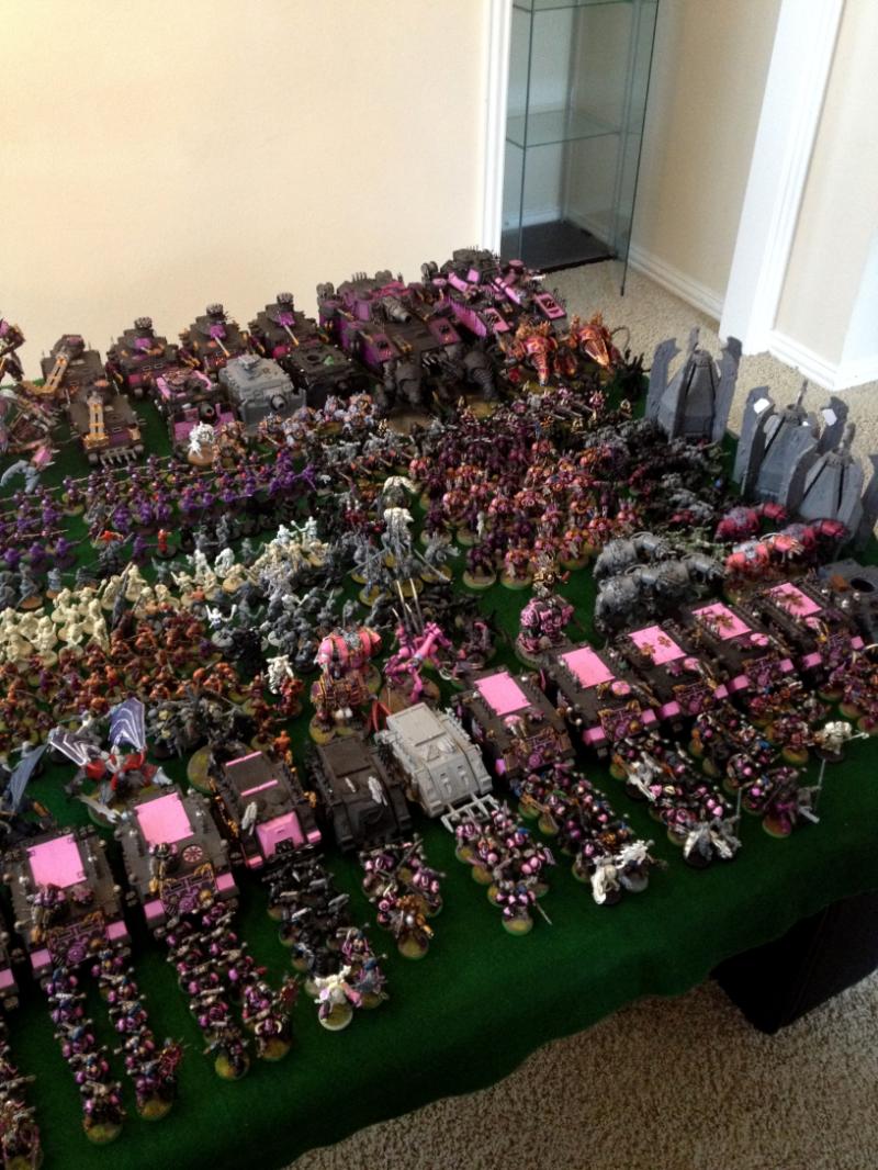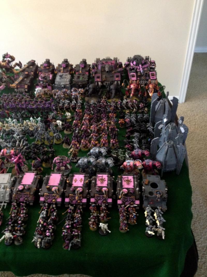 Well, I decided to inventory my army today. The pictures that follow include every model that comes from codex: chaos space marines and codex: blood angels (converted to chaos models) that I own. So it's missing all chaos daemons, as well as a tau allied detachment, some IG stormtroopers, fortifications, and some unbuilt models (like, 70 more marines...)