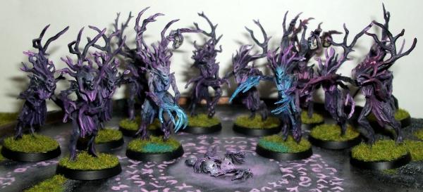 My daemons, I would paint the skin as a drybrush of grey and white first then use washes to glaze it and finally washes with a thin brush to add shading.