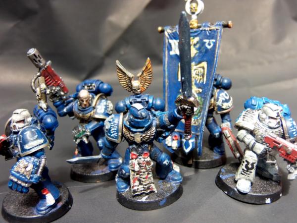 The command elements of my in-progress Ultramarines army. Lots of freehand, heraldry and kitbashing on these.