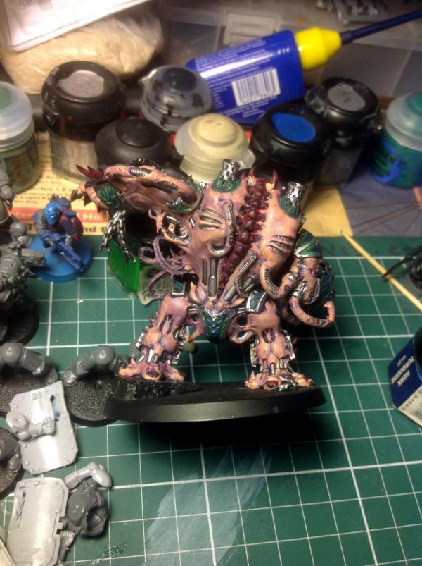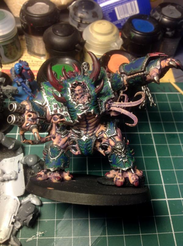 So I've got most of the colour on my Helbrute, however I can't decide what colour to paint his (its?) boney bits. Bearing in mind he's an Alpha Legion brute - red? Or green? (Bright green).