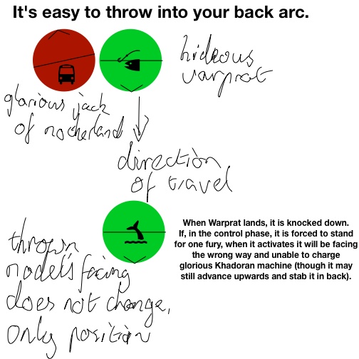 I kind of get what you mean on the first part, but I don't understand because I've seen it mentioned elsewhere that a trick with a Kodiak is to throw a model *behind* it (i.e. closer to your own guys). Maybe I misunderstood what I had read about the tactic (maybe it meant diagonally and not actually behind).
