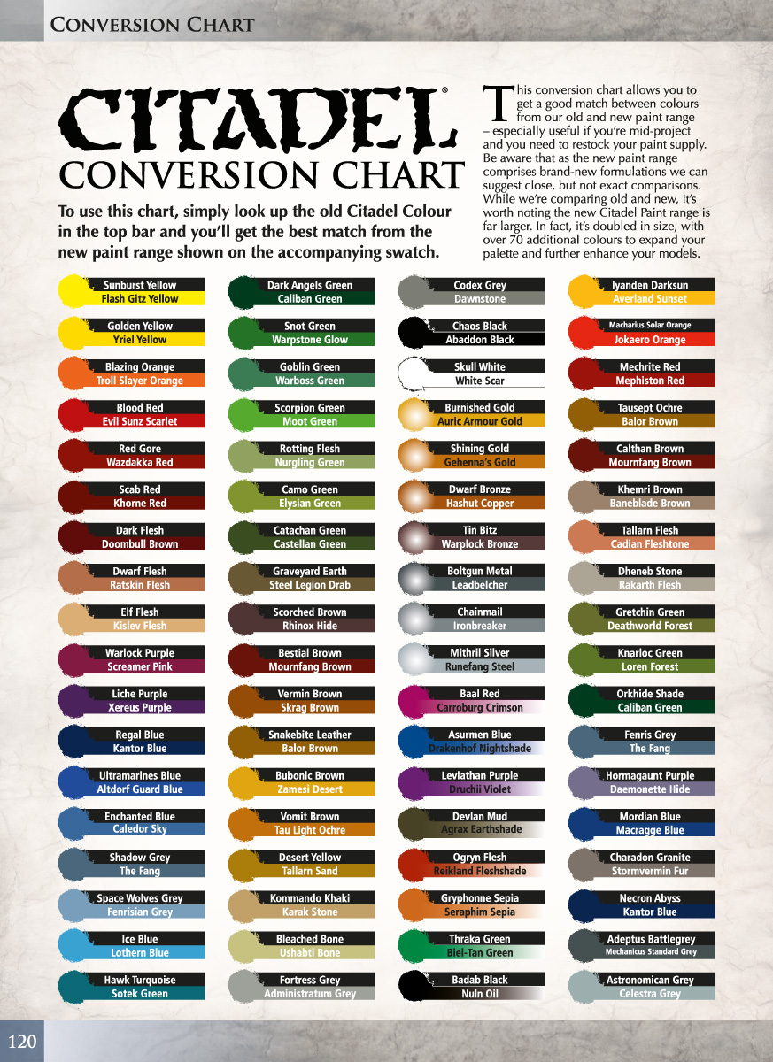 Dakka paint range conversion chart shows the matching colours from each range. ie. to match those colours you'd get: