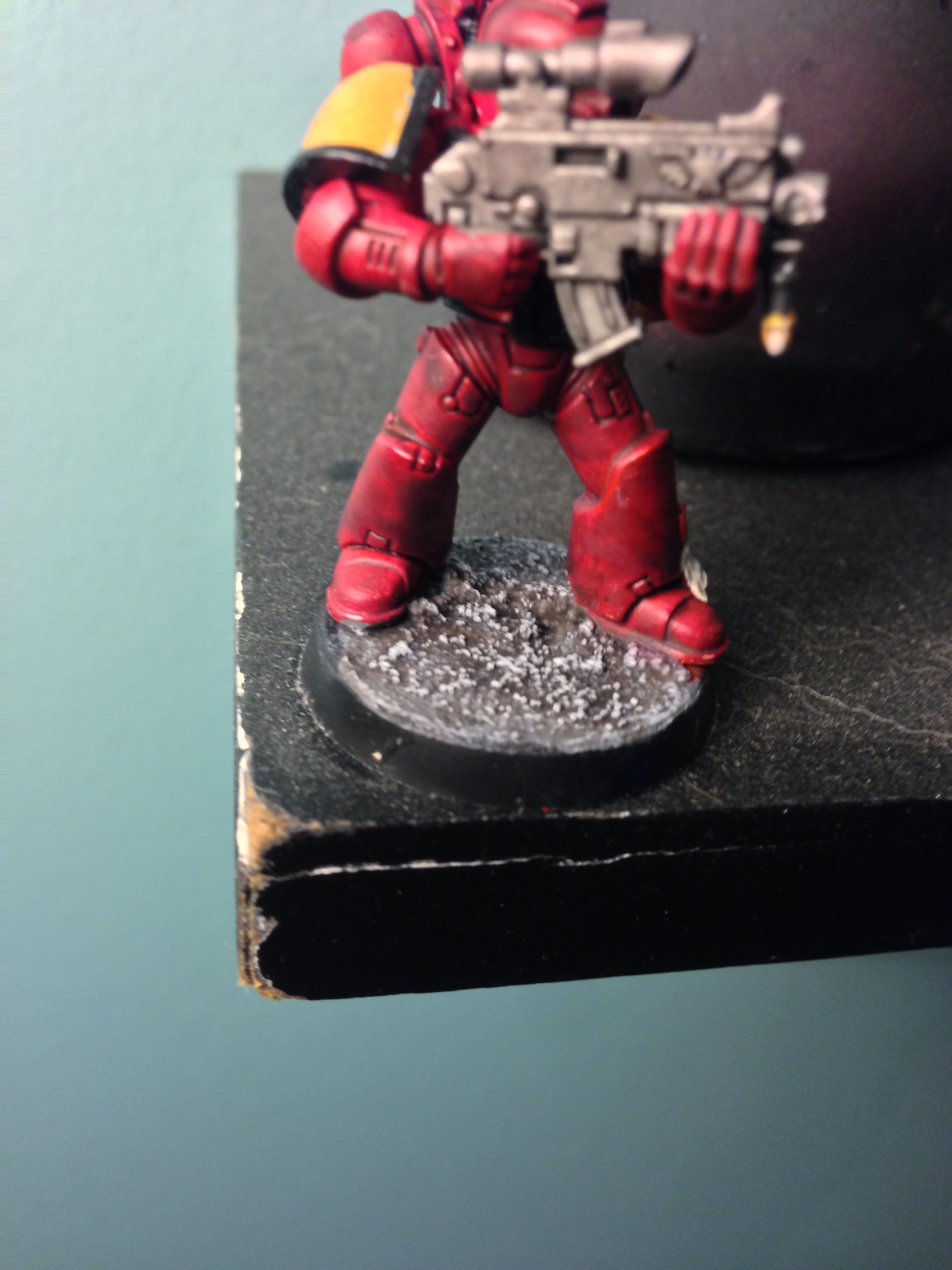 Paint on the face is a little thick mate. I use Folk Art 949 Skintone, with a 1-1 mix with good ole tap water. 1-2 coats then wash with Riekland Fleshshade (or equivilant) Otherwise looks good man I like the basing. Is it the new GW stuff?
