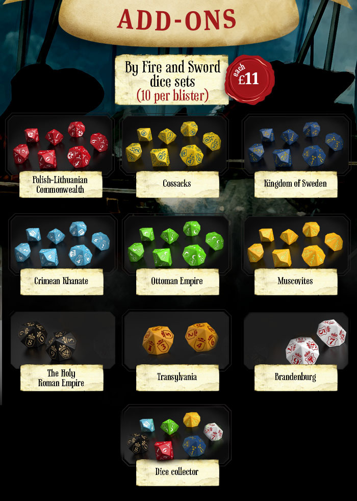 This will give You set of 9 dice – 1 dice from each faction: Polish-Lithuanian, Swedes, Cossacks, Tartars, Turks, Muscovites, Transylvanian, Brandenburgian and Imperials.