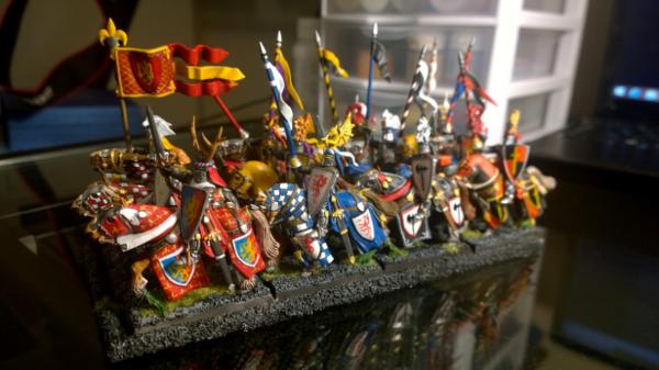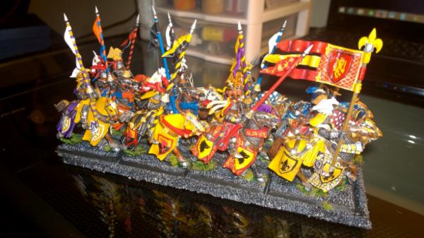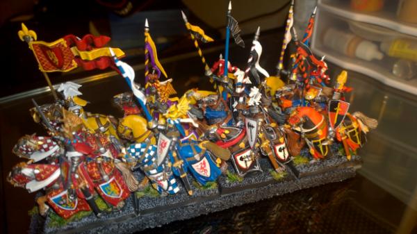 These are wonderful! I really like them. I love that big mix of bright colours, makes me think of the old school Eavy Metal jobs, and its just a joy to look at. They look like a single unit, but every miniature is unique. The freehand looks really good, I'm assuming on the banners and shields? I thought they were decals  well done!
