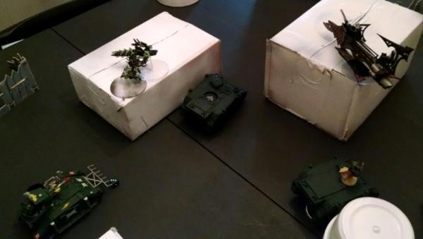The skimmers hid behind buildings expecting to wait out the first turn, while the jetbikes edged up to bladevane my exposed tactical squad on the first turn.