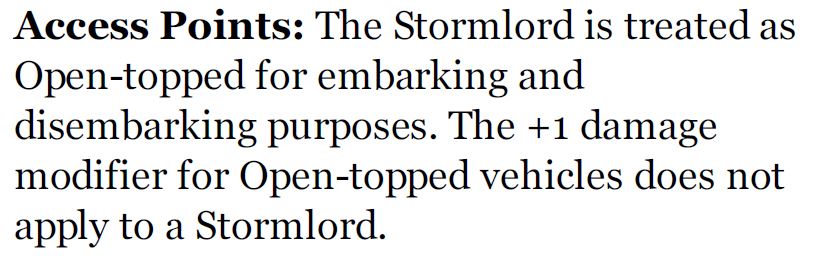 It says: "Open-topped vehicles do not have specific access points. Instead all of the vehicle is considered to be an access point." Same terminology. But your vehicle isn't treated as open topped for the purposes of what access points it has, merely for "embarking and disembarking purposes", remember? Since it's talking about access points and not disembarkation, I suggest that your same argument implies you can't ever disembark from the stormlord to begin with, because there are no access points to do so, since it's not ACTUALLY an open topped vehicle. So then why would they write any of that when they obviously didn't want you to put anything in the vehicle or take it out, ever?