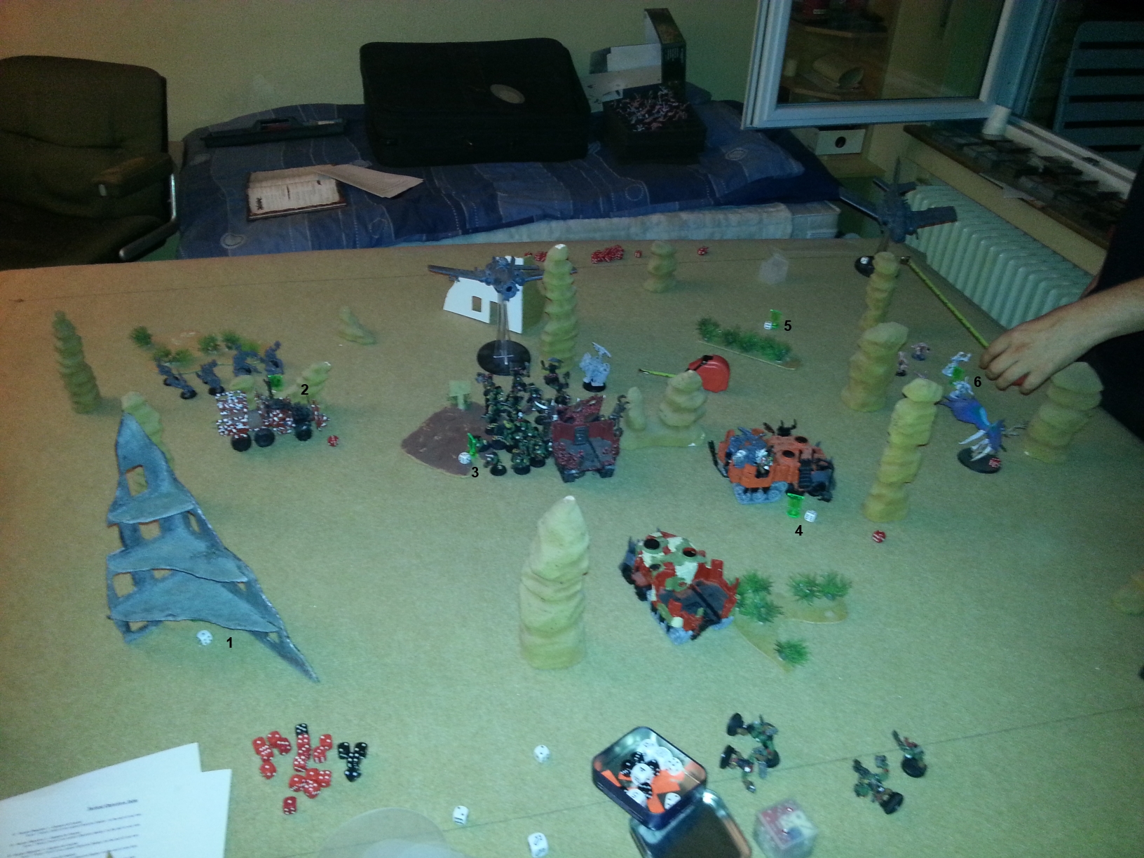 I currently control objectives 1(trukk), 2(trukk boyz), 3(warboss unit and shoota boyz), 4(underneath the tank-bustaz' battlwagon). 6 is held by pink horrors due to objective secured, which the tank bustaz lack, five is right next to it, I can pretty much drive any battlewagon onto it next turn.