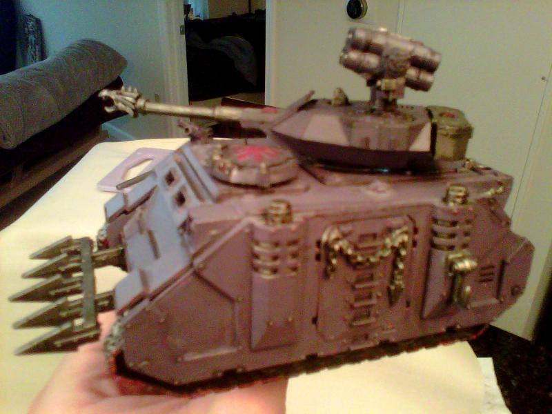 And here's my Rhino/Predator. Funny story here. I got a lot of my minis from a friend who stopped playing Blood Angels, and converted the loyalist models to chaos. Among them was a Razorback, but chaos doesn't get those. So, I had a Rhino with a sun-roof, essentially. After some thinking, I decided to get myself the turret of a Predator, so I could run it as such if I so desired, and the end result works very well. The turret tends to slide around a little, but I'm sure some magnetizing could fix that just fine. Sponsons are another story, but I have the option to take a 75pt tank if I want, now.
