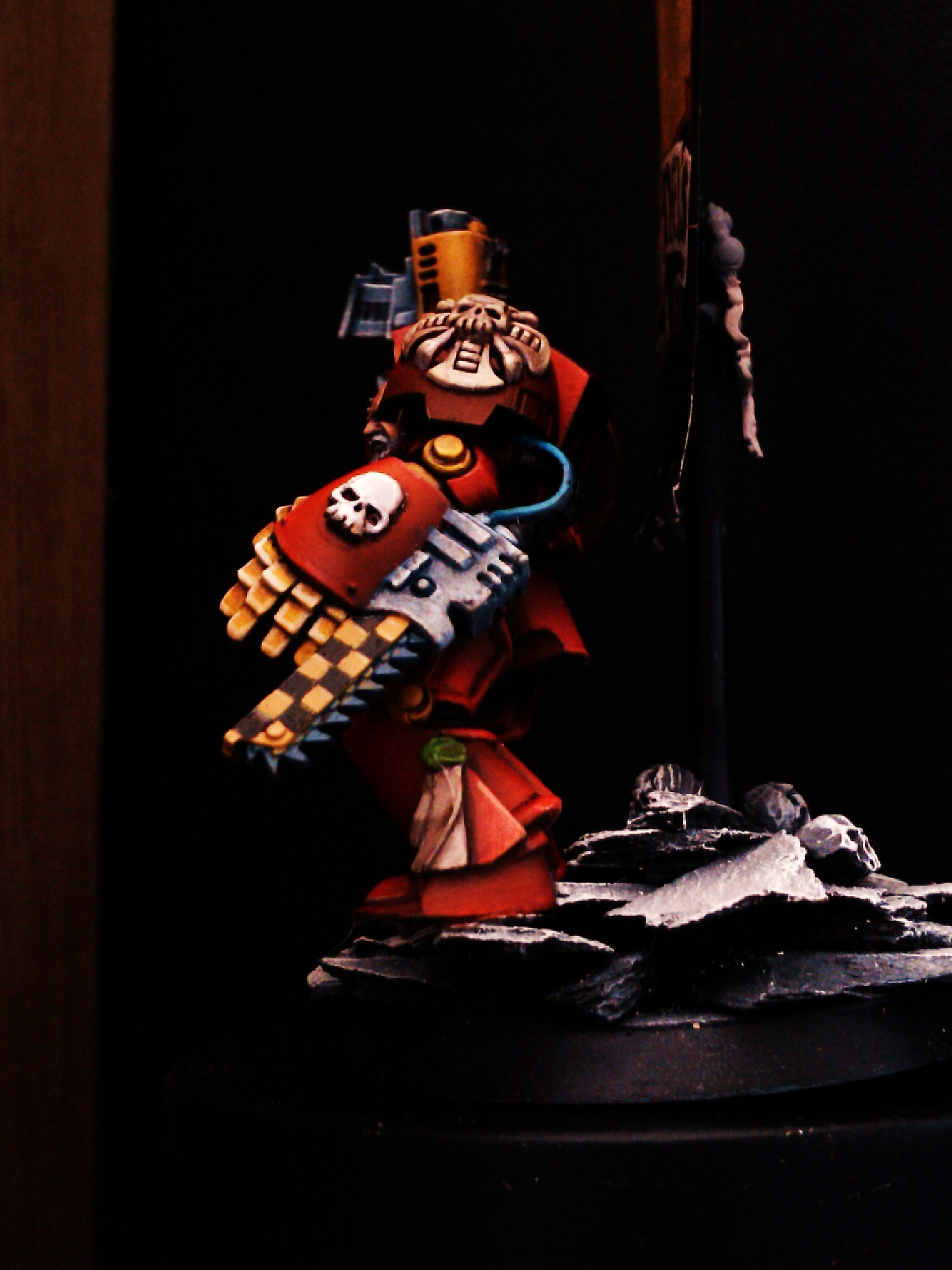 aside from the banner arm (i think a skeleton arm would look much better), and the yellow storm bolter casing and power fist finger (i prefer black), which have already been mentioned, i find the yellow of the right boot to be very jarring...
