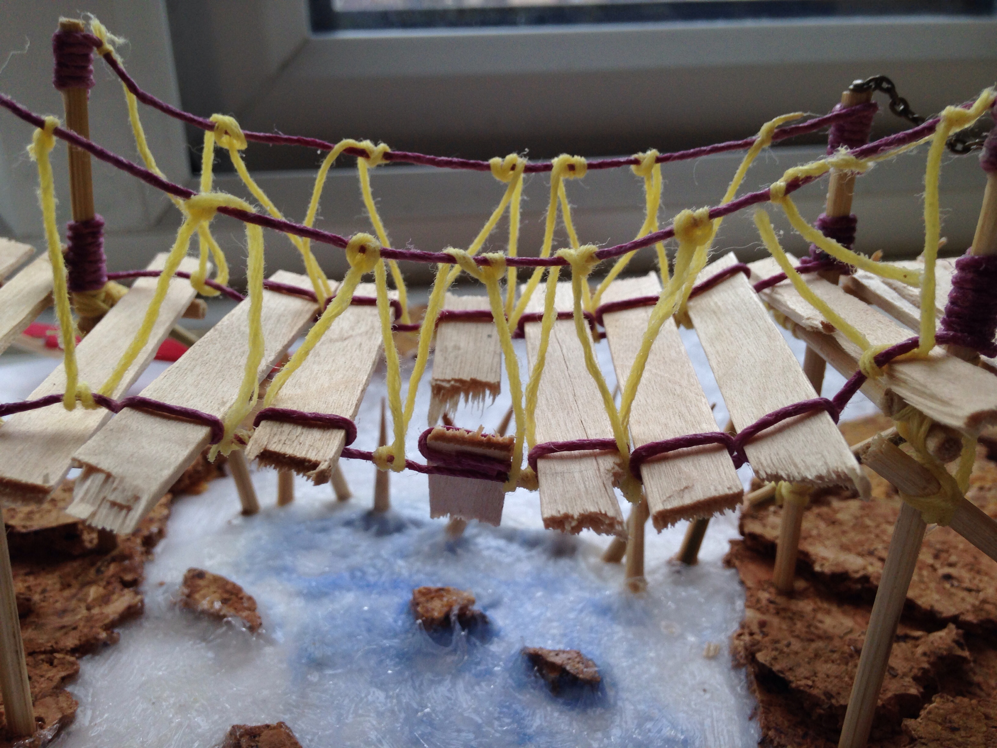 Thin out a bit of paint...whatever you base color will be...then pull a length of thread through it. Let it soak in quite well, then attach a weight to one end and hang it to dry (split shot is great for this). After that has dried - you end up with a pretty stiff, fully colored length of string. You can now use it like waxed string for doing ship rigging, wrapping around pylons on docks or rope bridges as you have done (easier than regular string when you want things to look taught).