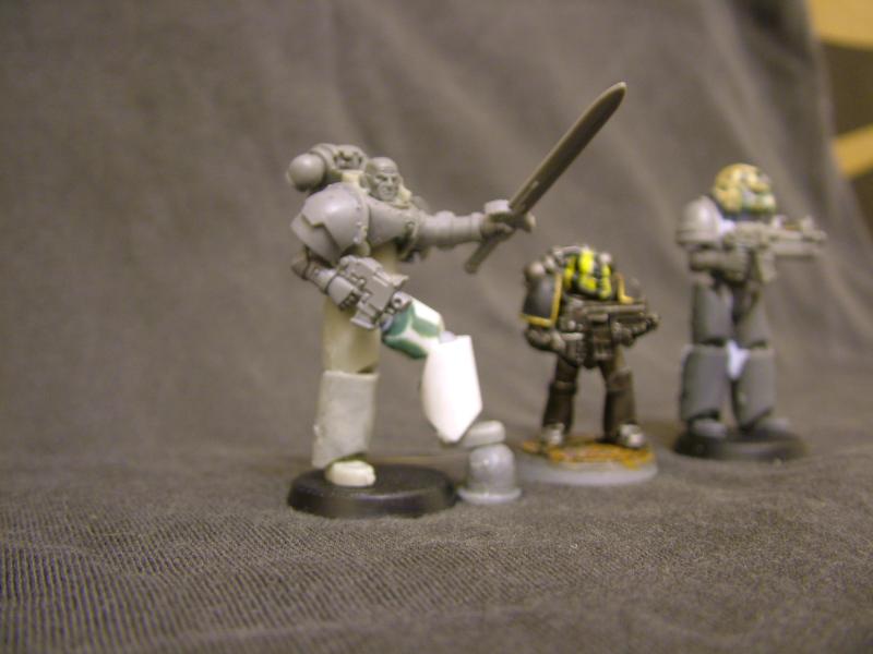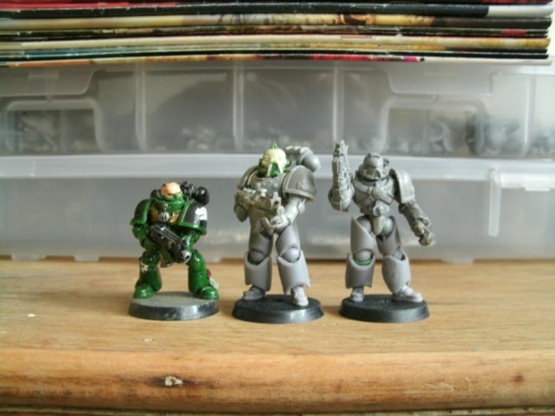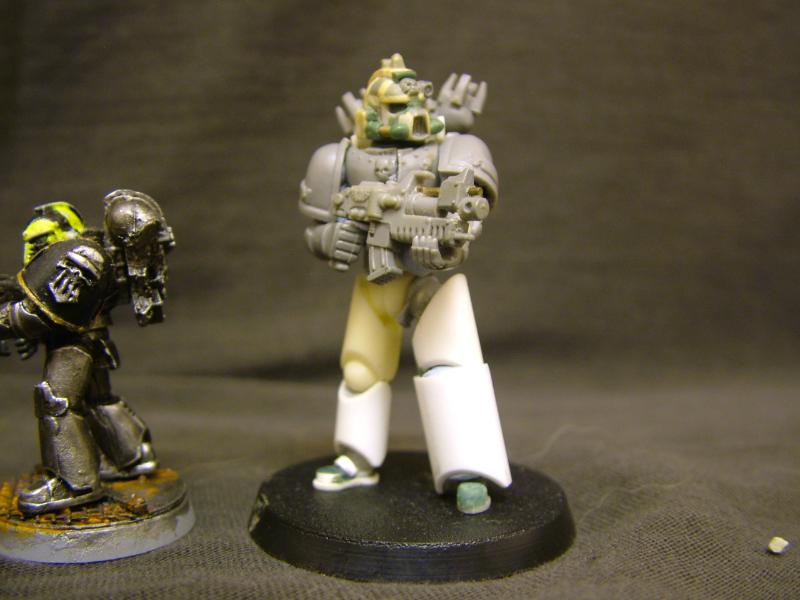 So I reworked the top part of the legs as I wasn't too happy with the Green Stuff work I'd done. I'm actually quite happy with how these look with just ordinary marine torsos so I think I may well just leave it at legs and save myself some effort. I don't particular hold with the idea of Astartes being nigh on nine feet high so there isn't much room to make a taller marine that isn't just far too big. That said, I like making bigger marine models so I think I might just do exactly that, make some bigger models just for their own sake, not ones that particularly have to fit in with regular sized figures.