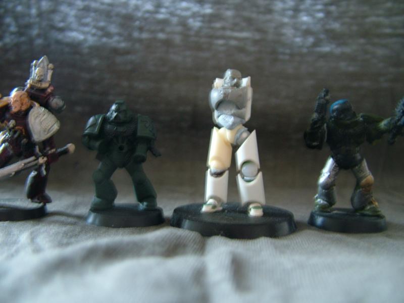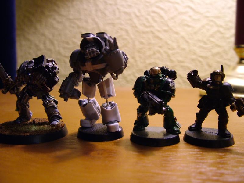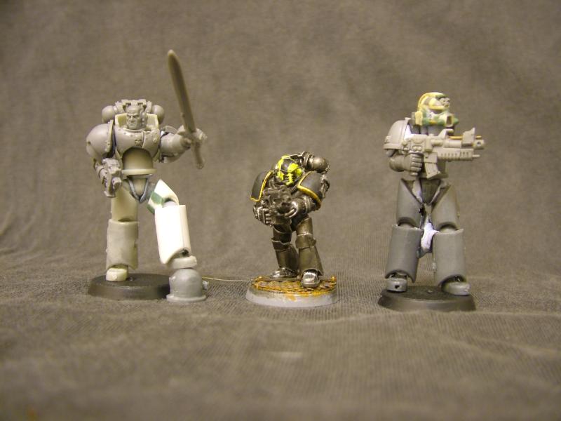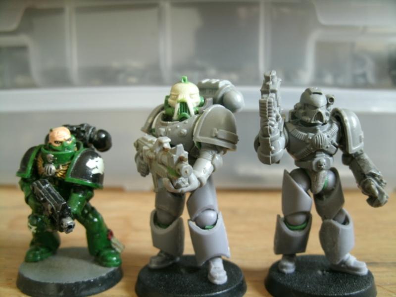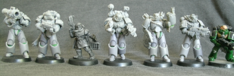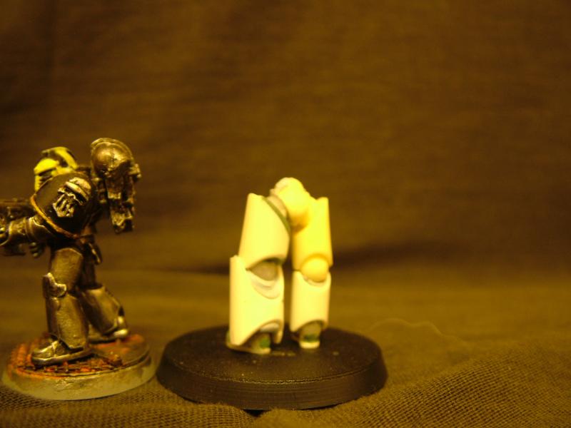 Just another brief WIP shot to show current progress. So I have five sets of legs at the early stages of having detail sculpted in. Still need to make some kneepads for them as well as some other bits and pieces, then scribe in a few panel lines and such and fill in some air bubbles, then I can get on with making a mould. The right most marine uses my own torso and helmet but for comparison the left most marine uses just regular plastic components. I didn't have an Imperial Guardsman handy so I've used an Eisenkern trooper instead, although he is a bit taller than a Citadel model.