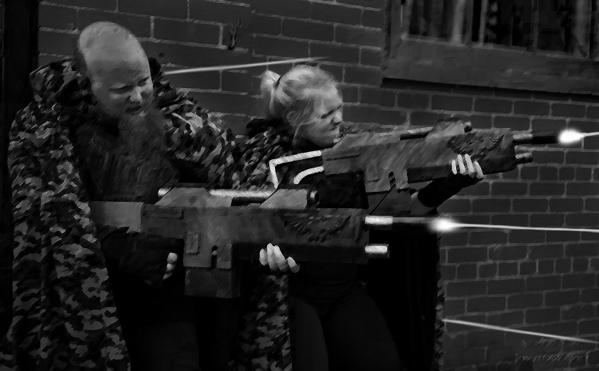 Nice job, my main comment is that you two need more pouches with the costumes. If you can find some cheap US surplus combat vests or something like it would add to the look. From what I remember of the books all of the ghosts had some sort of vest. Right now you guys look a little bare. But still nice job on amour and the lasguns.