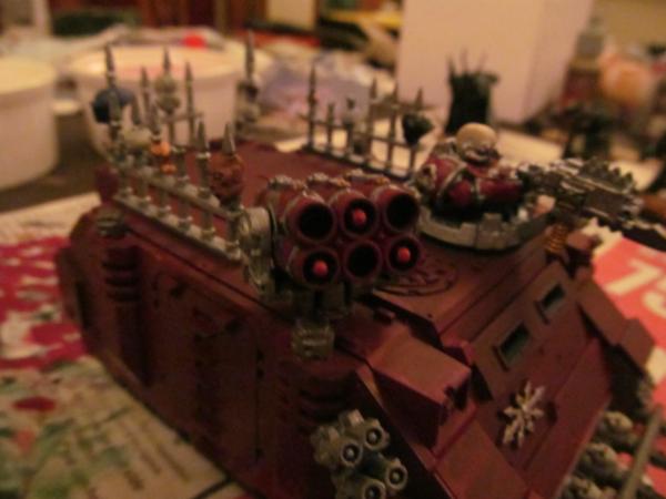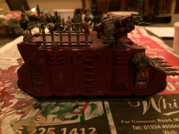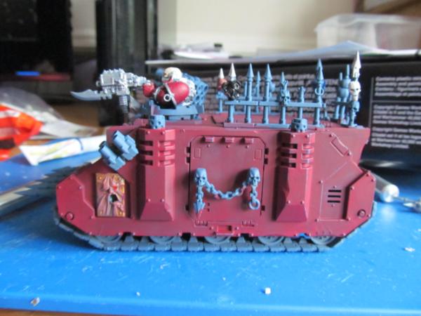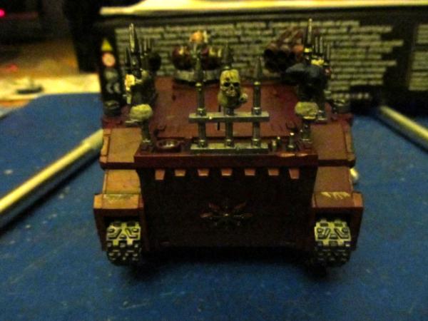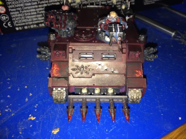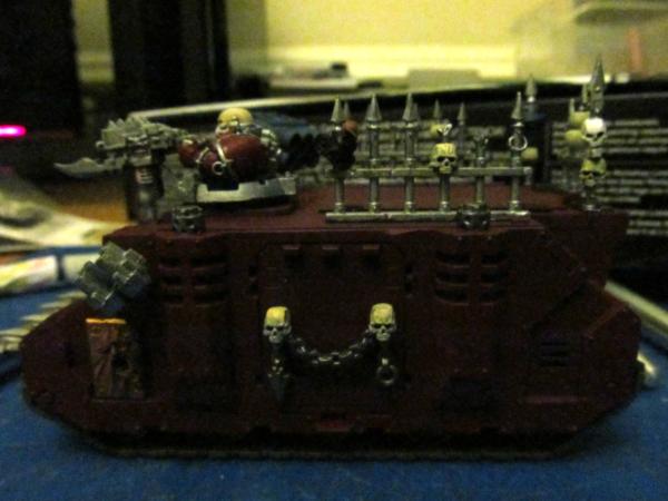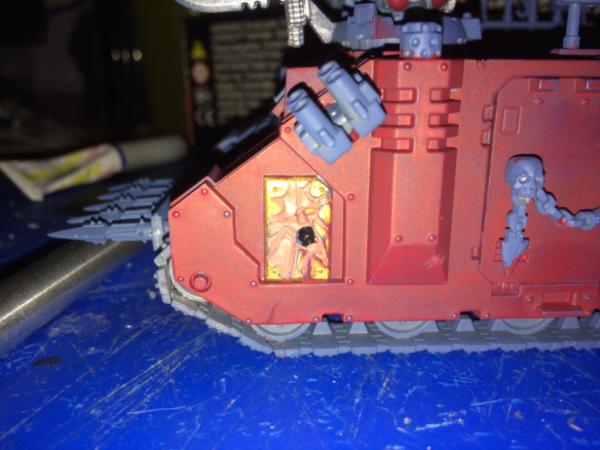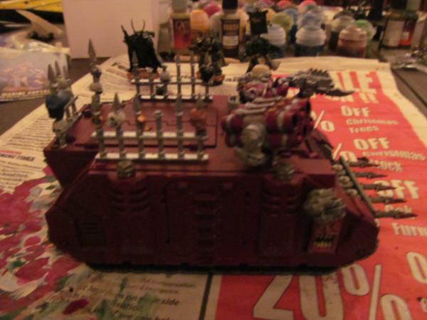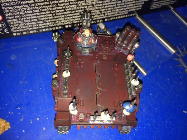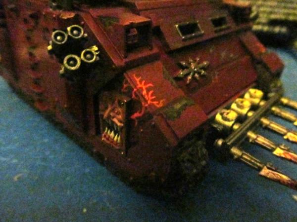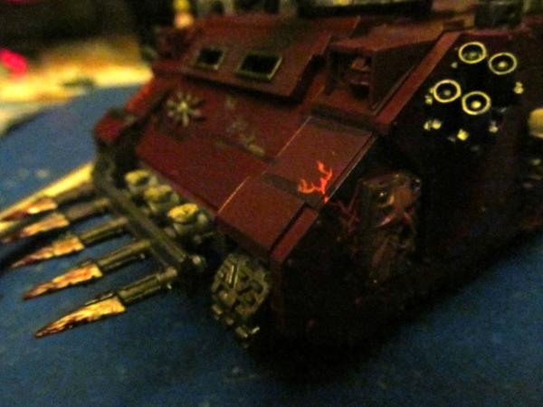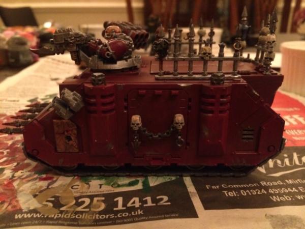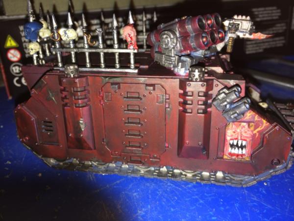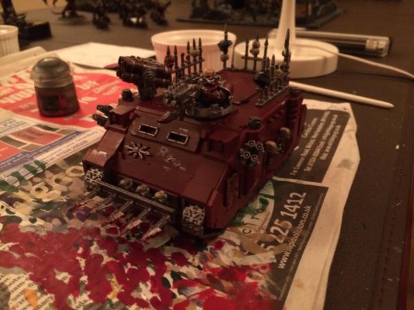 The Blood God shined upon me today, shedding the blood of the strongest Bloodletters onto the rhino to enhance its strength in combat. This has covered the entire Trophy Glorification armour, Trophies on the spikes as the gunner as well have began to bleed in dedication to the Blood God.