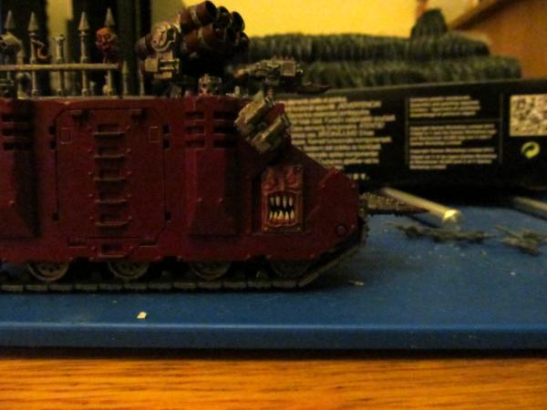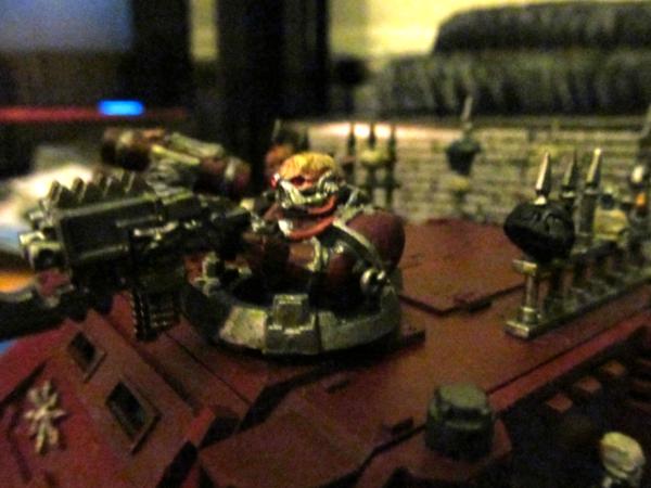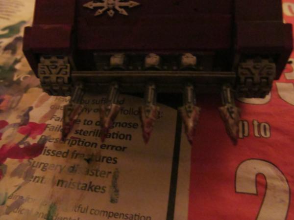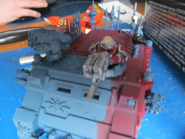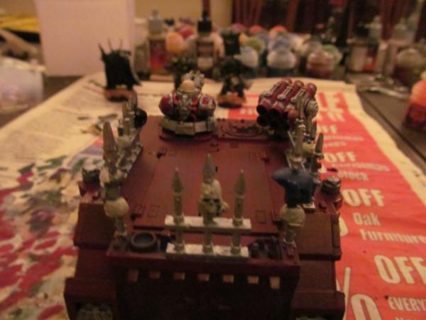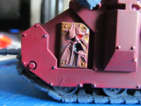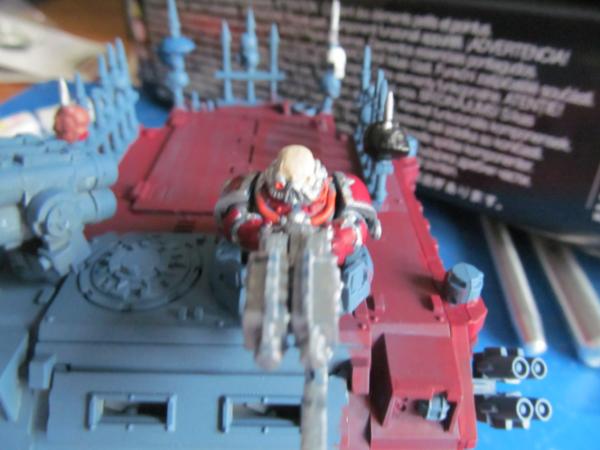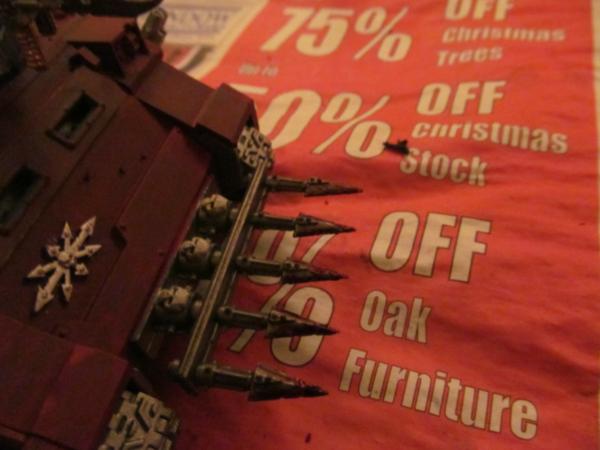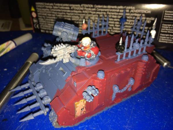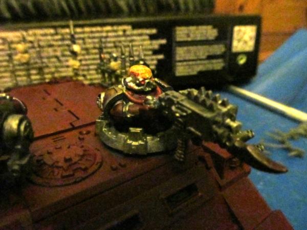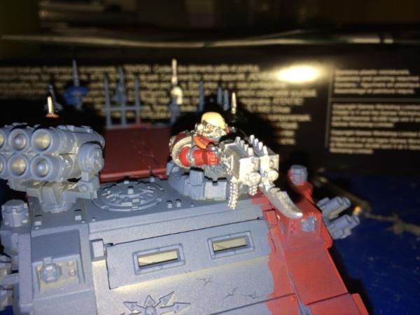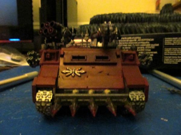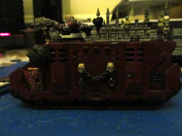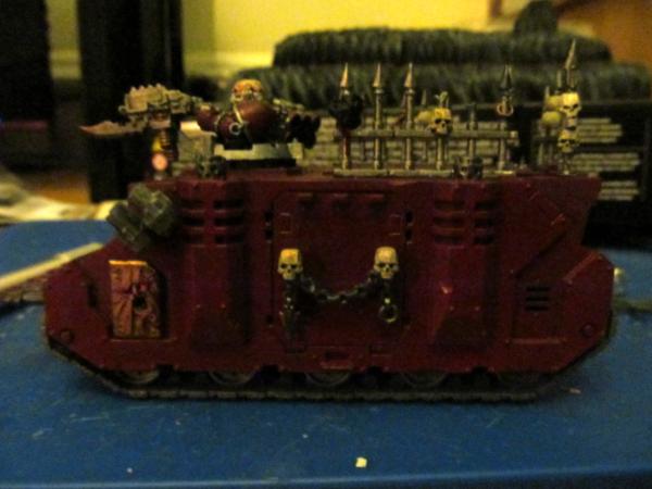 The Blood God shined upon me today, shedding the blood of the strongest Bloodletters onto the rhino to enhance its strength in combat. This has covered the entire Trophy Glorification armour, Trophies on the spikes as the gunner as well have began to bleed in dedication to the Blood God.