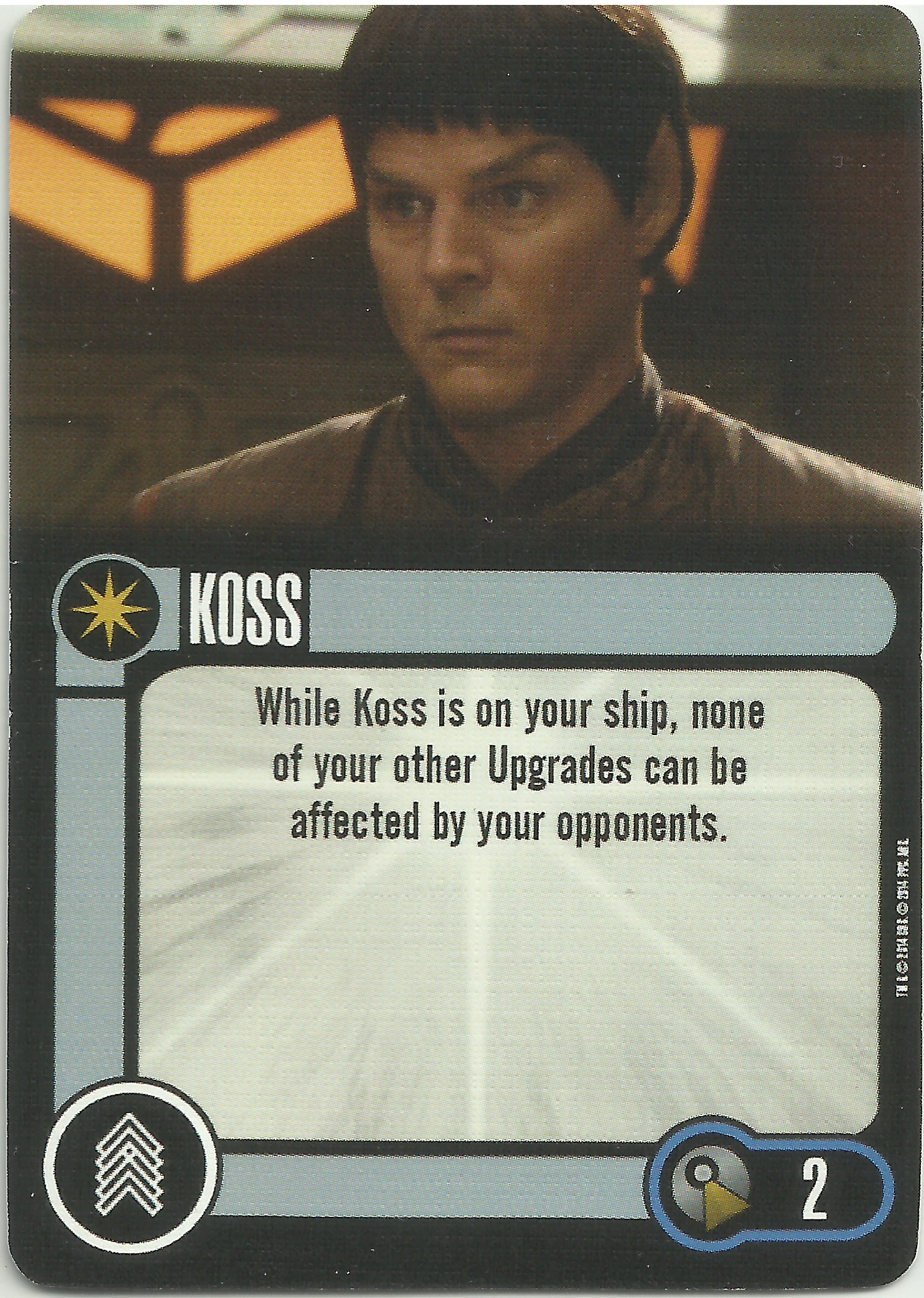 Koss (Text ability is basically none of your upgrades can be affected by your opponents) is way, way under cost for what he does, and he nullifies all those "Silver Bullet" builds that negate all your upgrades. He's also another anti-Borg card. No Assimilation Tubules for you! I would expect Koss to become a key feature on many ships in the future.