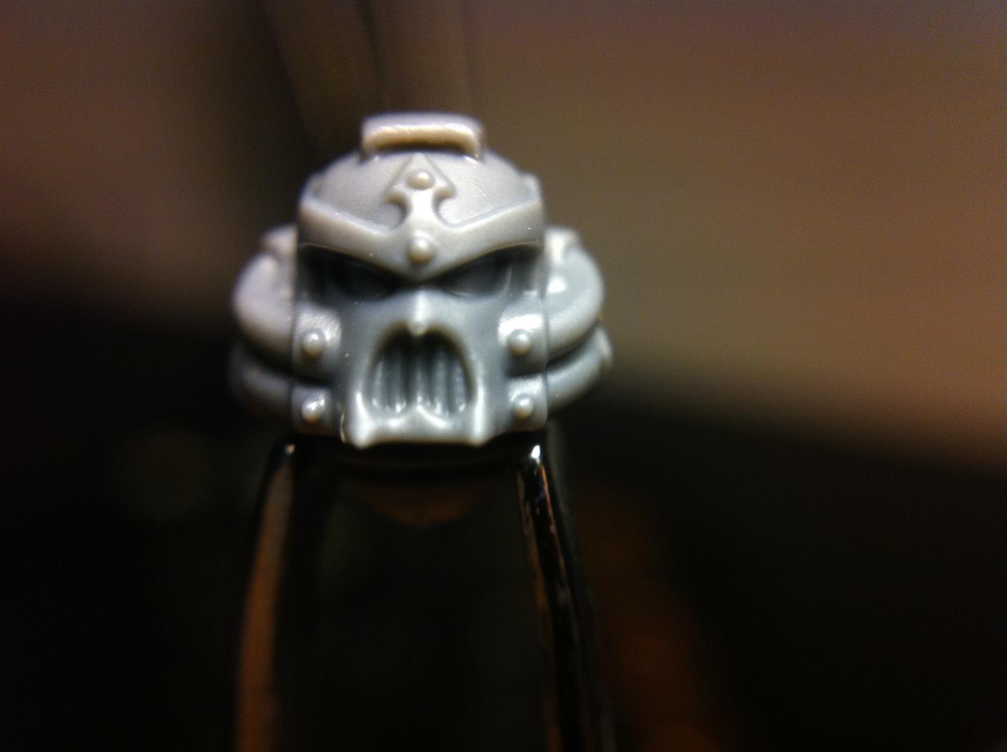 Ok! So I finally got around to doing some sculpting. This was a regular Mk7 Aquila head from a Tac Marine, chopped up his face and resculpted it. This is actually an instant mould and greenstuff recast, which didn't come out as well as I'd hoped (the two halves of the mould didn't line up, which is why I didn't bother painting the back of the head because it's not lined up properly anyway  also some of the details got a bit warped). So I'll probably do some silicone/resin recasts, I have done a couple of variants that are similar (the only variation being the number of vertical vents and the size/presence of the tube leading in to the face of the mask). I'll probably combine a few of these, a few other ones I've sculpted with the Ravenwing and Black Templar heads. Something about the straight down face plate just looks way tougher and meaner than you're average Spehss Mareenz, at least to me