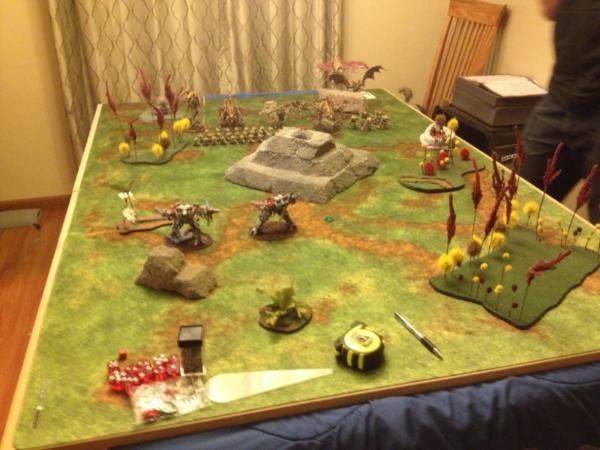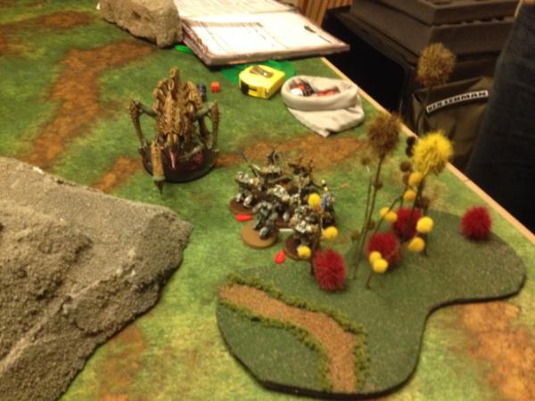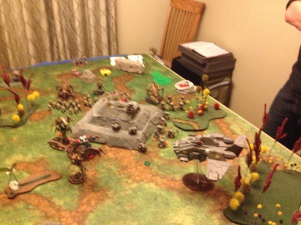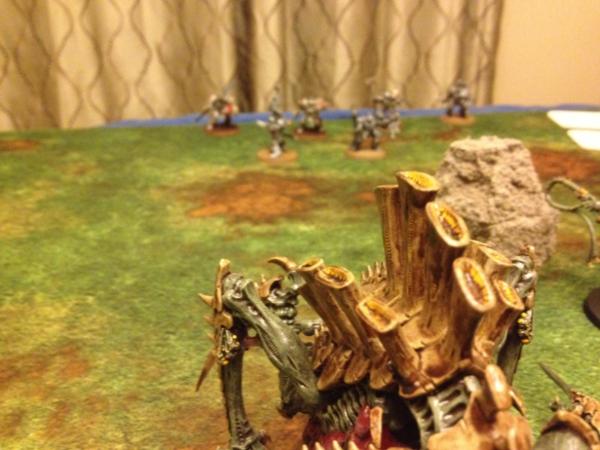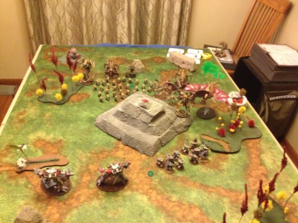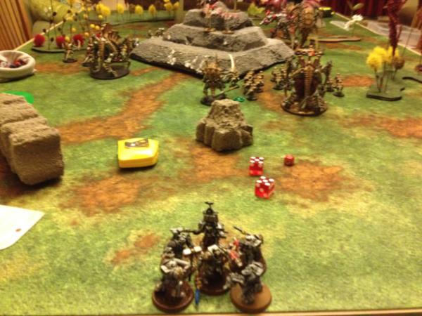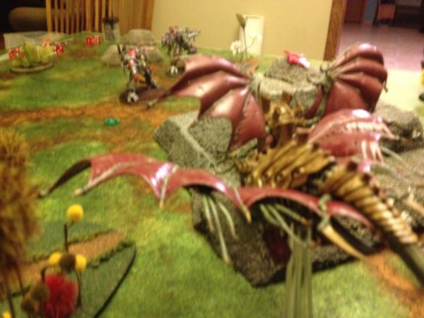 I actually forgot to snap pics during his turn, but this is from the start of my third. His Mawloc failed to come in, his Flyrant shot my Termies and killed the Psycannon. Trygon actually made his 9" charge into my Dreadknight, we both put two wounds on each other. Gargoyles moved up and took the relic. Warriors moved up and shot my Pallies, maybe did 1 wound. His Tervigon made 16 Gants, but crapped out in doing so. He needed Objective 1, and to destroy a unit.