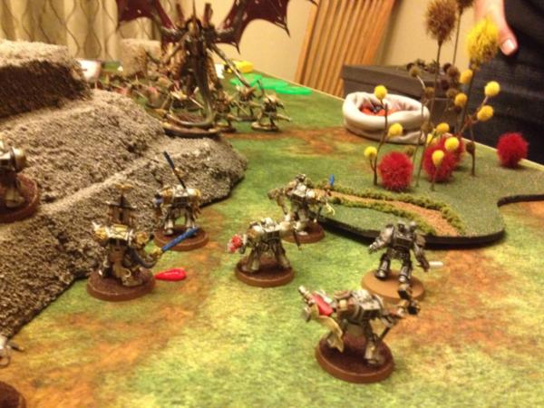 He took first turn. He starts everything on the board, huddled right up on the deployment line. He had assumed I would null deploy, but I put my Dreadknights on the board after seeing how nicely bunched up he was. I did not attempt to seize.