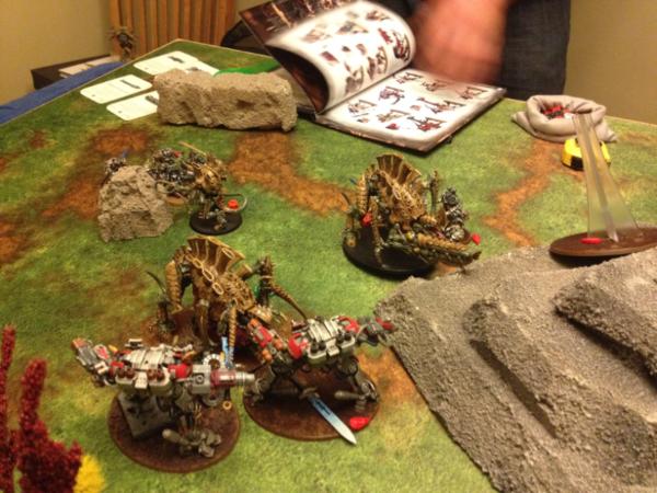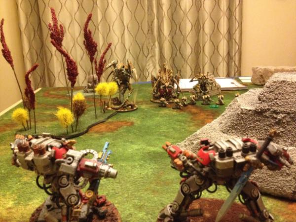 The Dreadknights tag-team the Tervigon, but actually fail to kill it due to poor rolls and Catalyst giving it FNP. Tervigon directed its attacks at my wounded Dreadknight, but failed to hurt him. The Warlord Libby and his squad shoot and charge the Tyrannofex, killing it despite its 2+ save. The other Libby and his squad shoot and charge the Hive Tyrant, killing him as well. He rolled poorly with his Bonesword, I believe only doing 1 wound. Stormraven had attempted to shoot the Tyrannofex, but missed due to BS1 with everything.