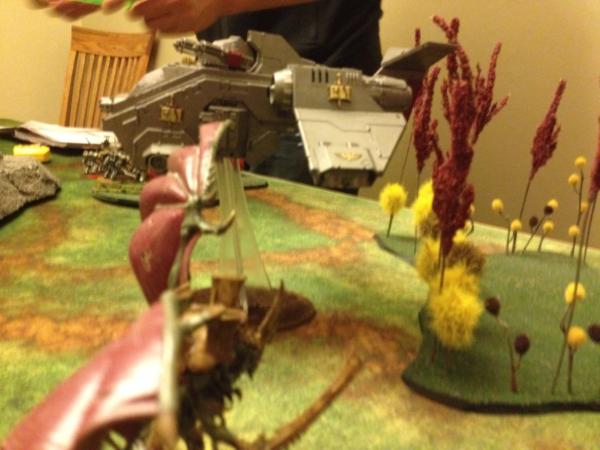 The Flyrant turns and successfully casts Paroxysm on the Stormraven, lowering it to BS1. His twin-linked devourers strip off one HP.