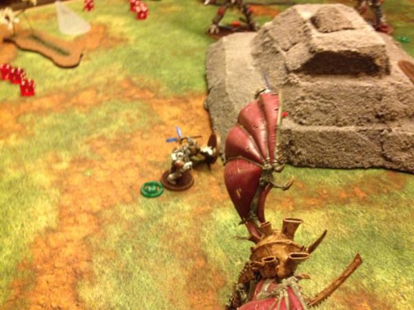Flyrant tries psychic shenannigans against my Dreadknight, got denied. The DK also shook off the shooting from the flyrant. He did draw Objective 1 for his Maelstrom, which he was firmly planted on.