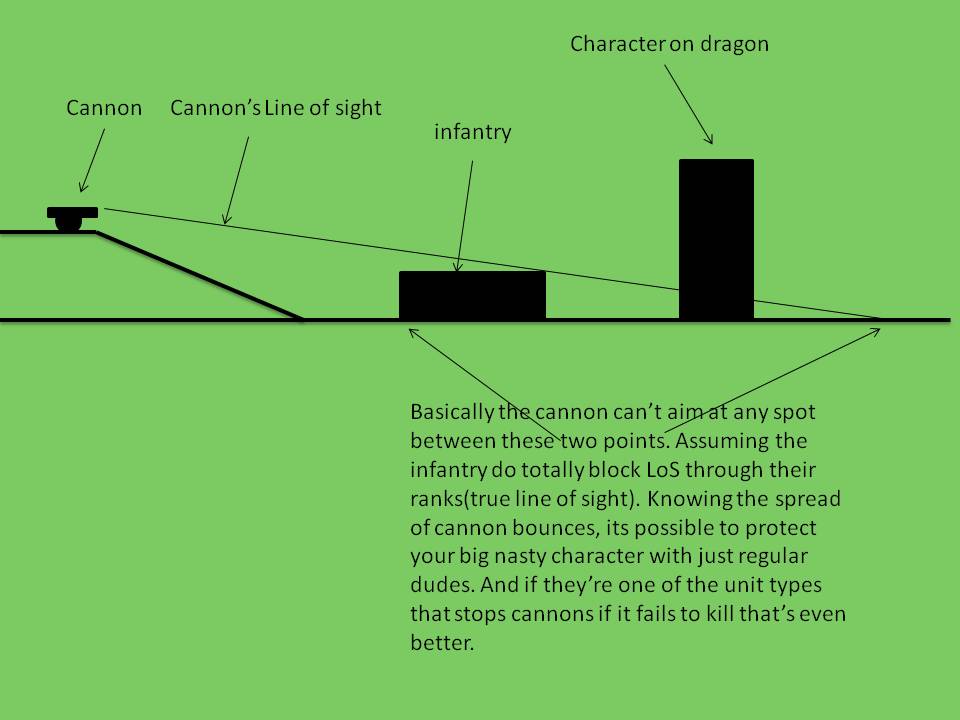 This means even a unit of infantry can block LOS to the area behind them, meaning the initial aiming spot has to be in front of said unit(beware units which don't block much LoS) Tons of people don't follow this rule correctly and I think that is partly to blame for cannons being seen as powerful as they are. It doesn't matter that the cannon can see your character, it needs to see the ground in front of him. *i'll make a handy little diagram in a minute.