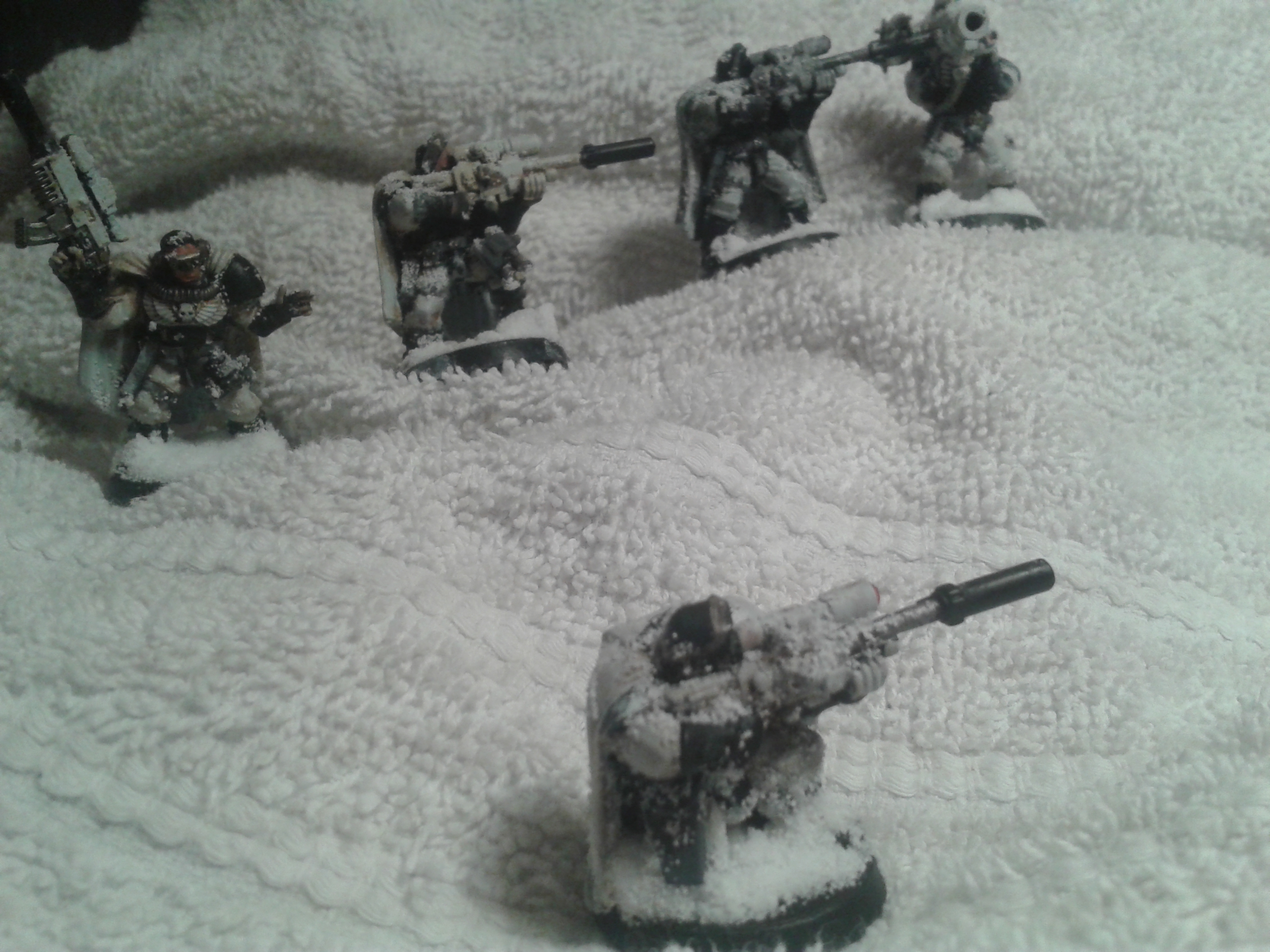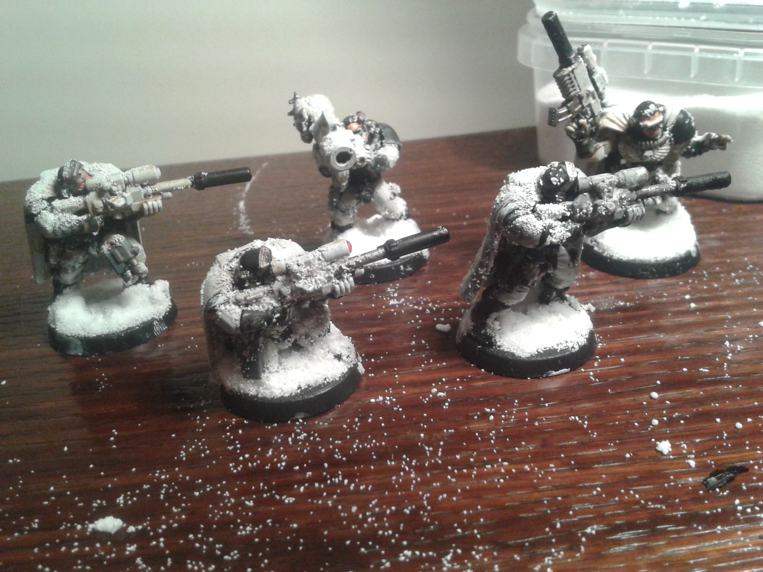 You can also get good looking bases for about five dollars. Just buy a bag of basing sand from any sort of art supply store and some PVA glue, then glue that sand down. The snow drifts on the base are neat, but yeah, the black peeking through looks a bit rough. If you glue sand down, paint that (could even do a grey/brown scheme or something suitably desaturated) the snow would look better on top of it.