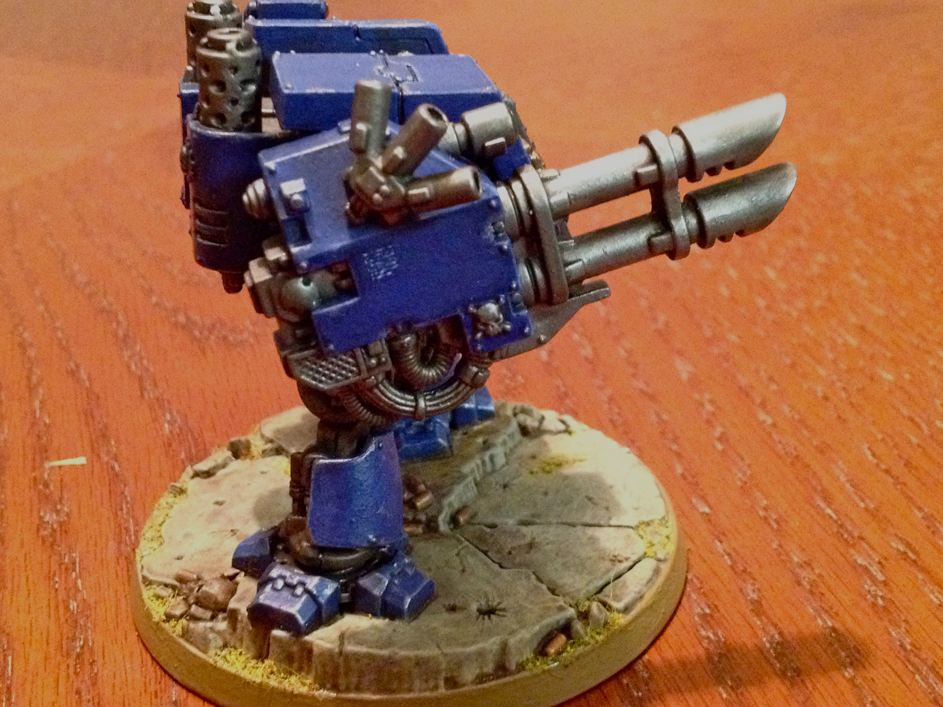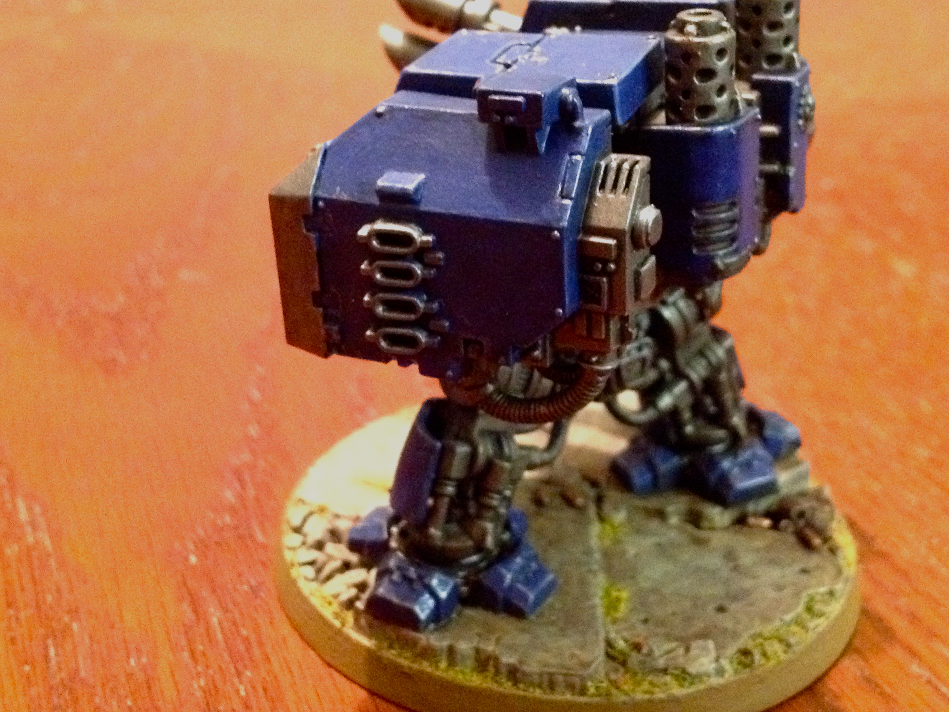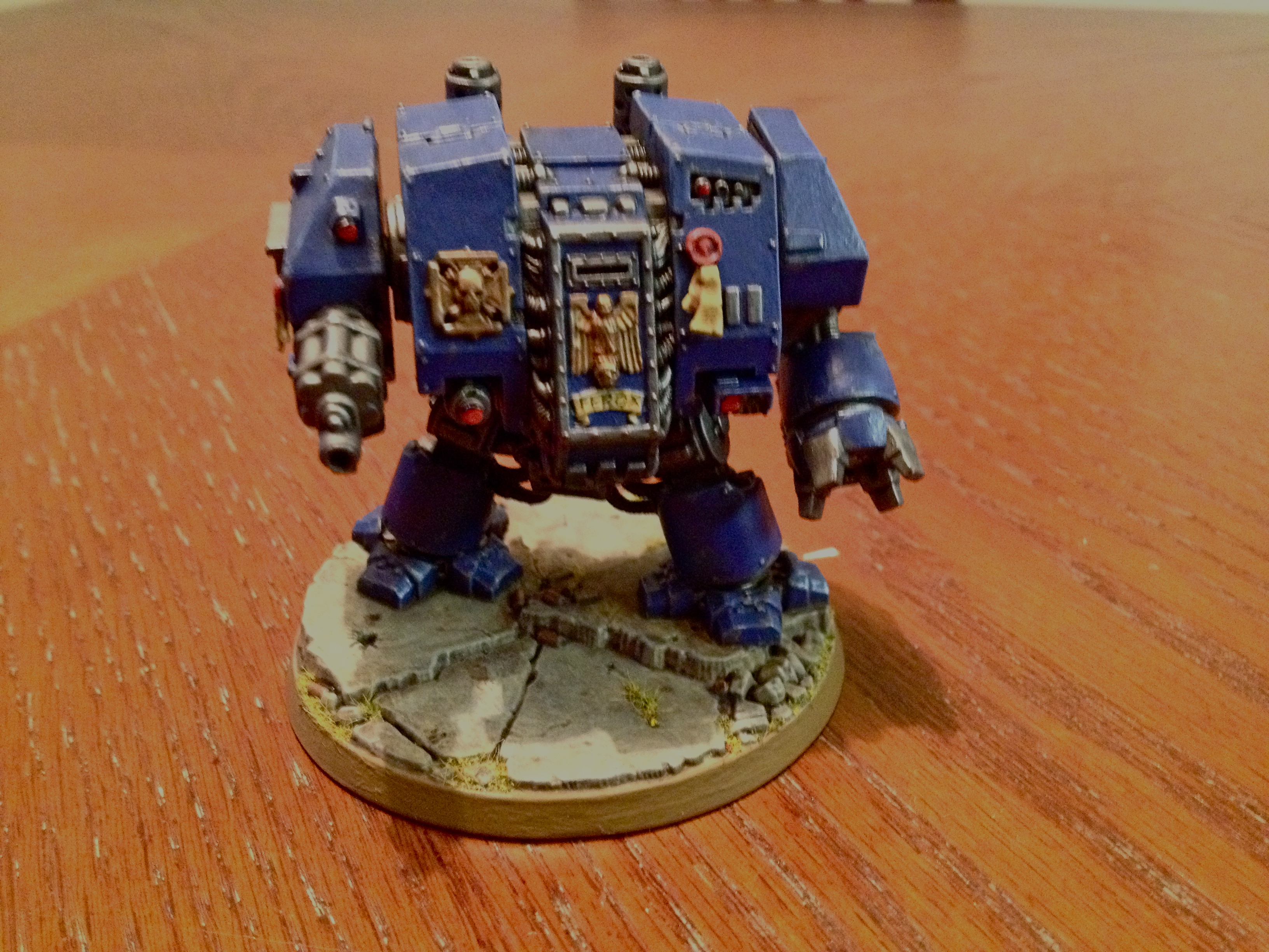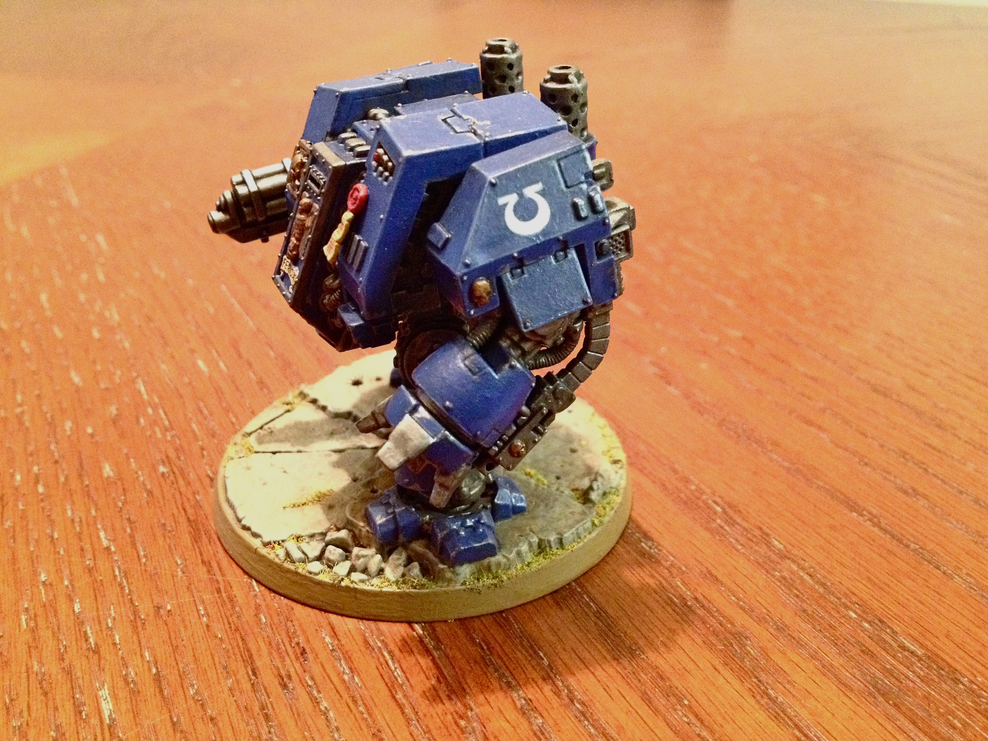If there is one thing I think you could do to the model itself, more decals (or freehand). The only Ultramarine iconography is on the power fist arm. I might add some to the other arms, or the leg plates. But besides that, a very nice dread.