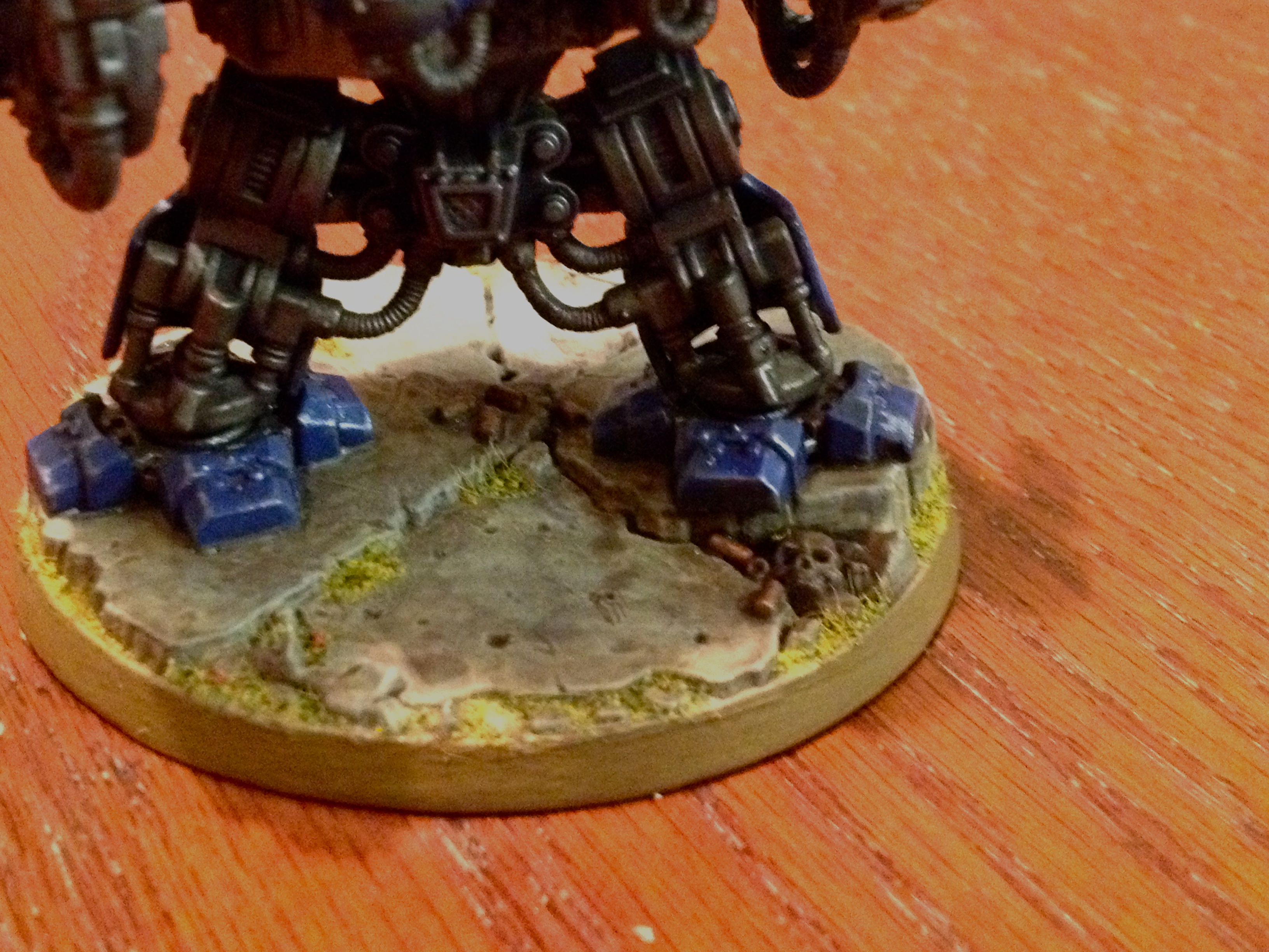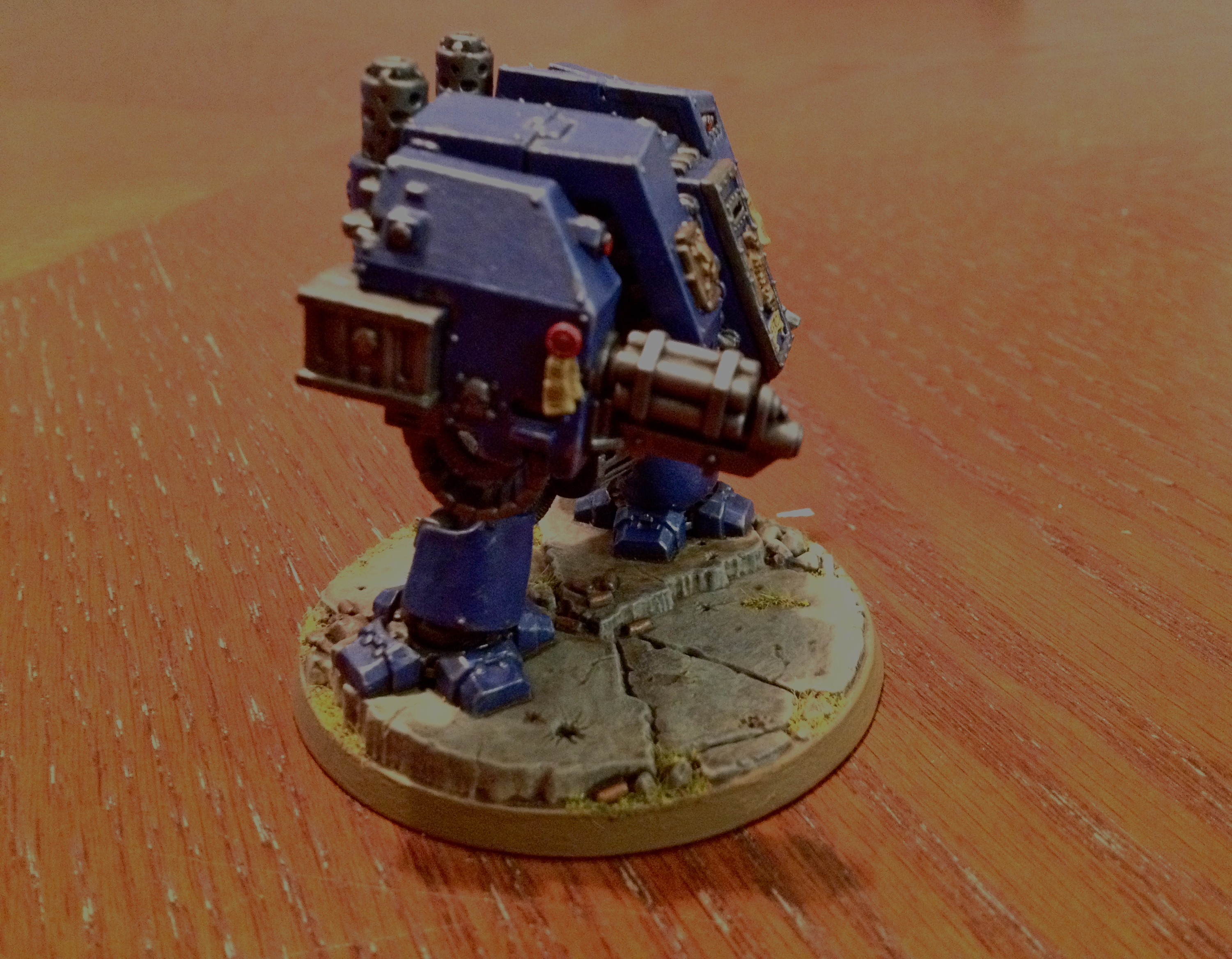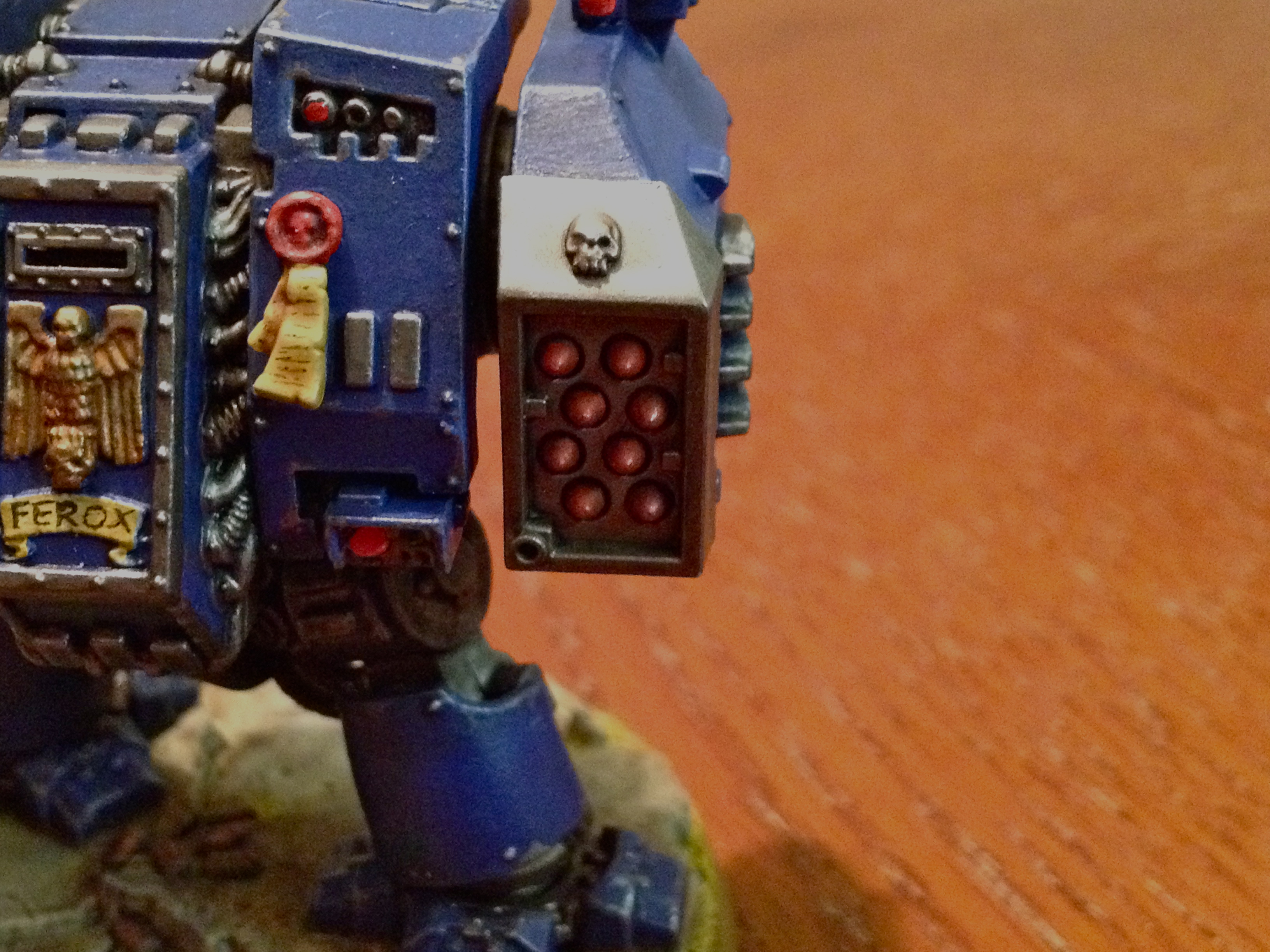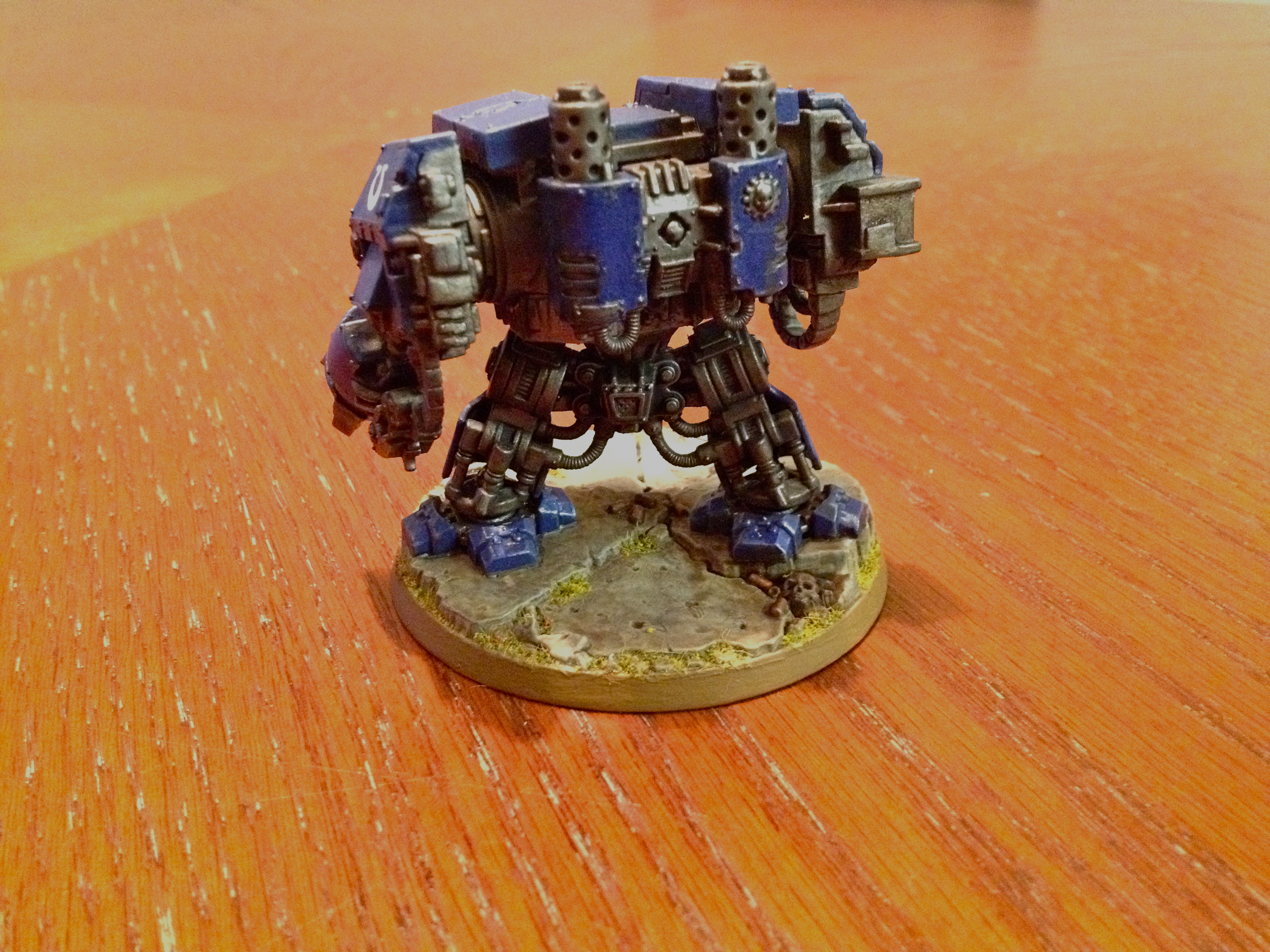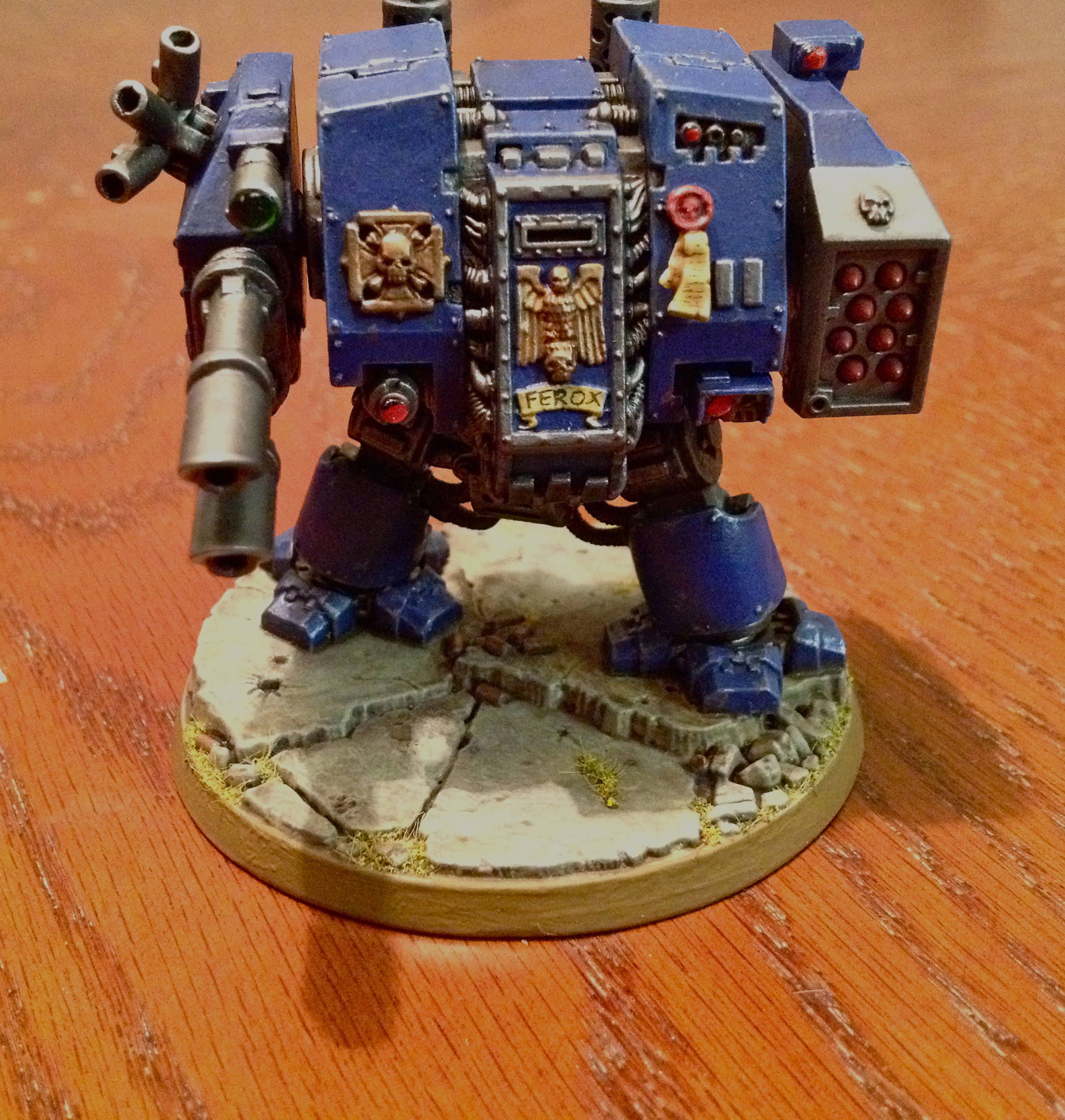 If there is one thing I think you could do to the model itself, more decals (or freehand). The only Ultramarine iconography is on the power fist arm. I might add some to the other arms, or the leg plates. But besides that, a very nice dread.