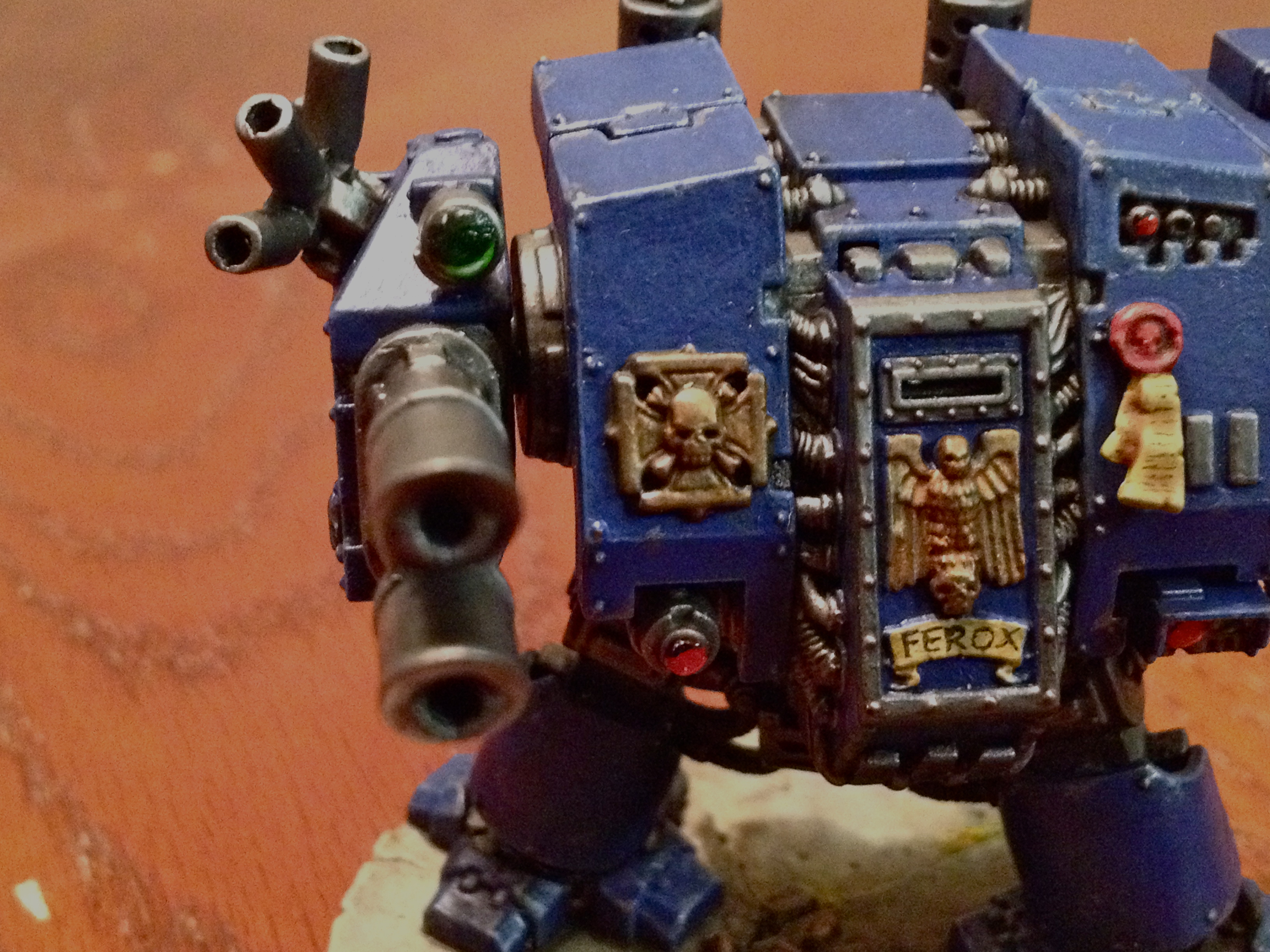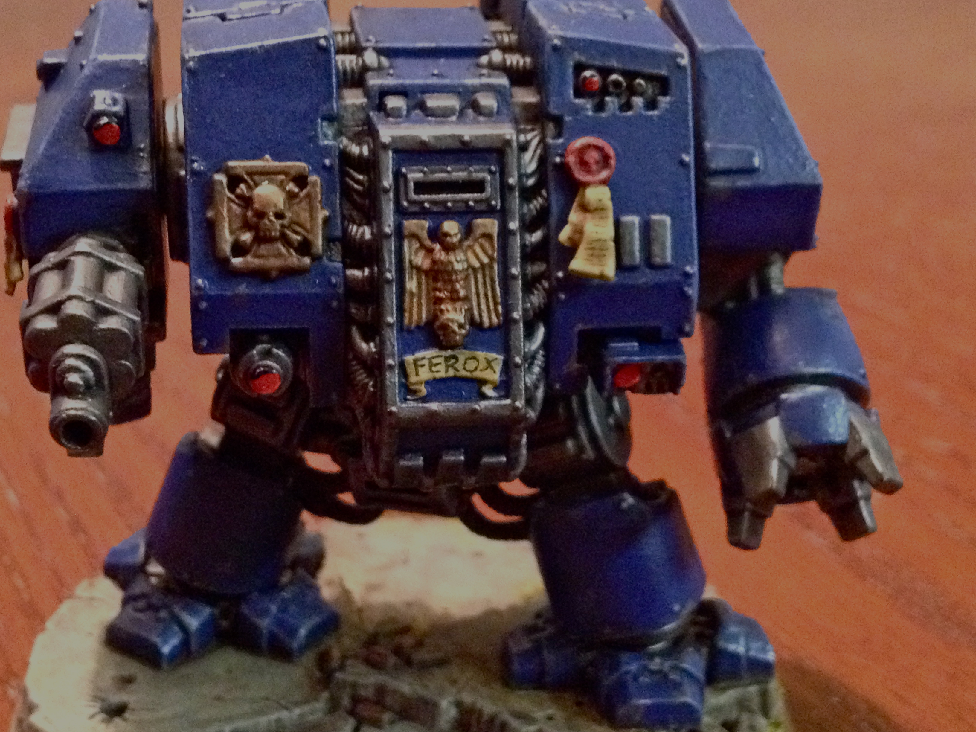 Very nice and clean. I tend to paint most of my stuff sans battle damage and grime, so this is right up my alley. If I were to offer some criticism, though, it would be to add a bit of color. Try and include the company colors somewhere on the dread and/or apply a few more decals. SM dreads are supposed to be ancient warriors, so some battle honors and markings will go a long way towards making this piece stand out in your army.