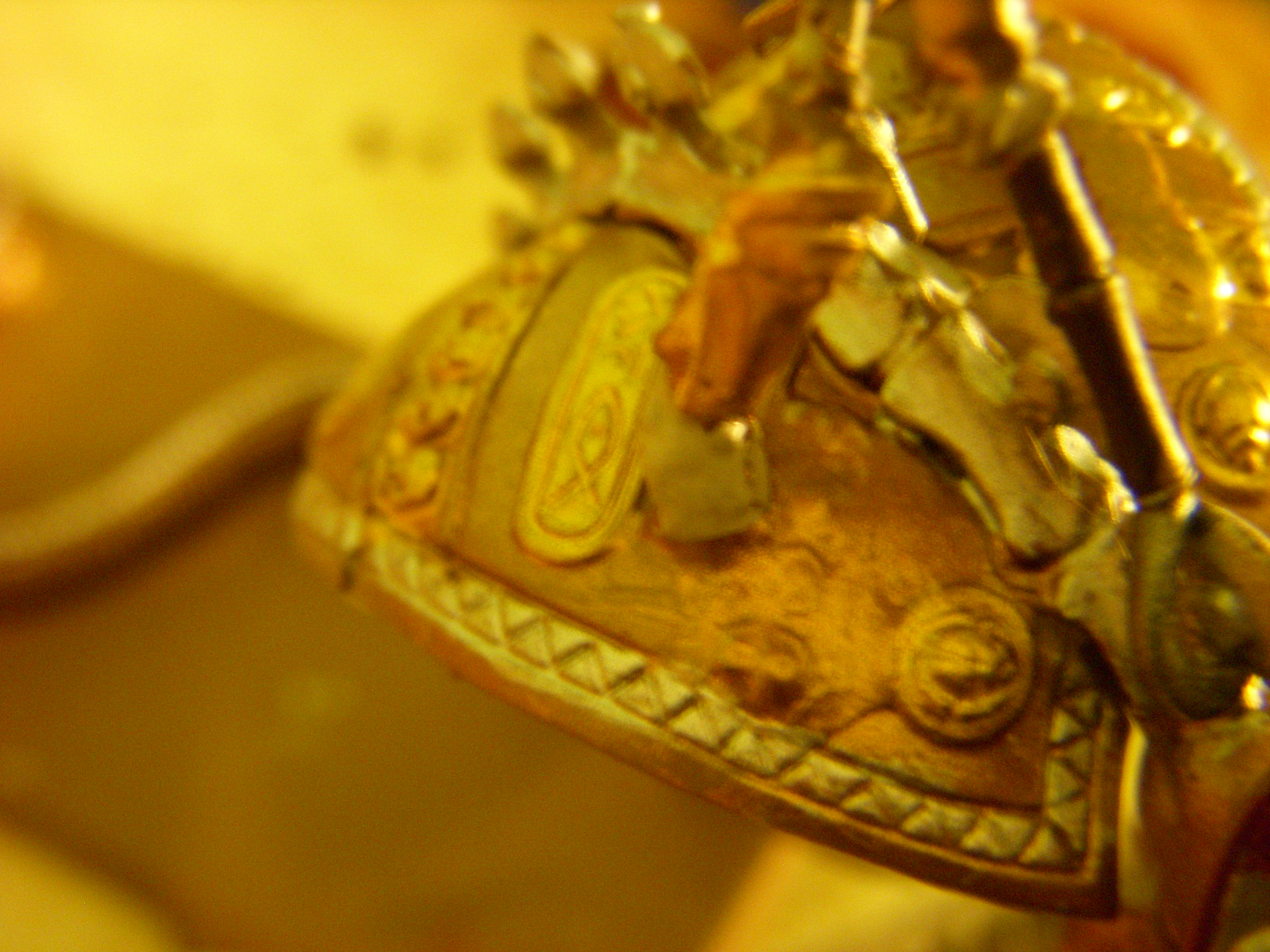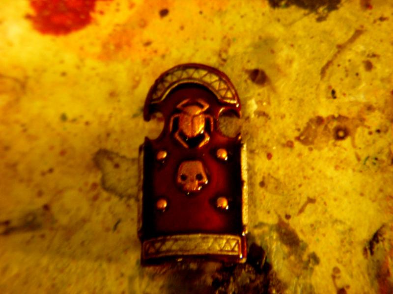 The knights sheild, before the Shade dried. Also serves as a first look at the Forsaken Army colors. The edge detials are done in Runefang steel, the center details in some shade of gold I forgot the name of (The orangish one), and the rest done in a 1:1 mix of Khorne Red and Rhinox Hide