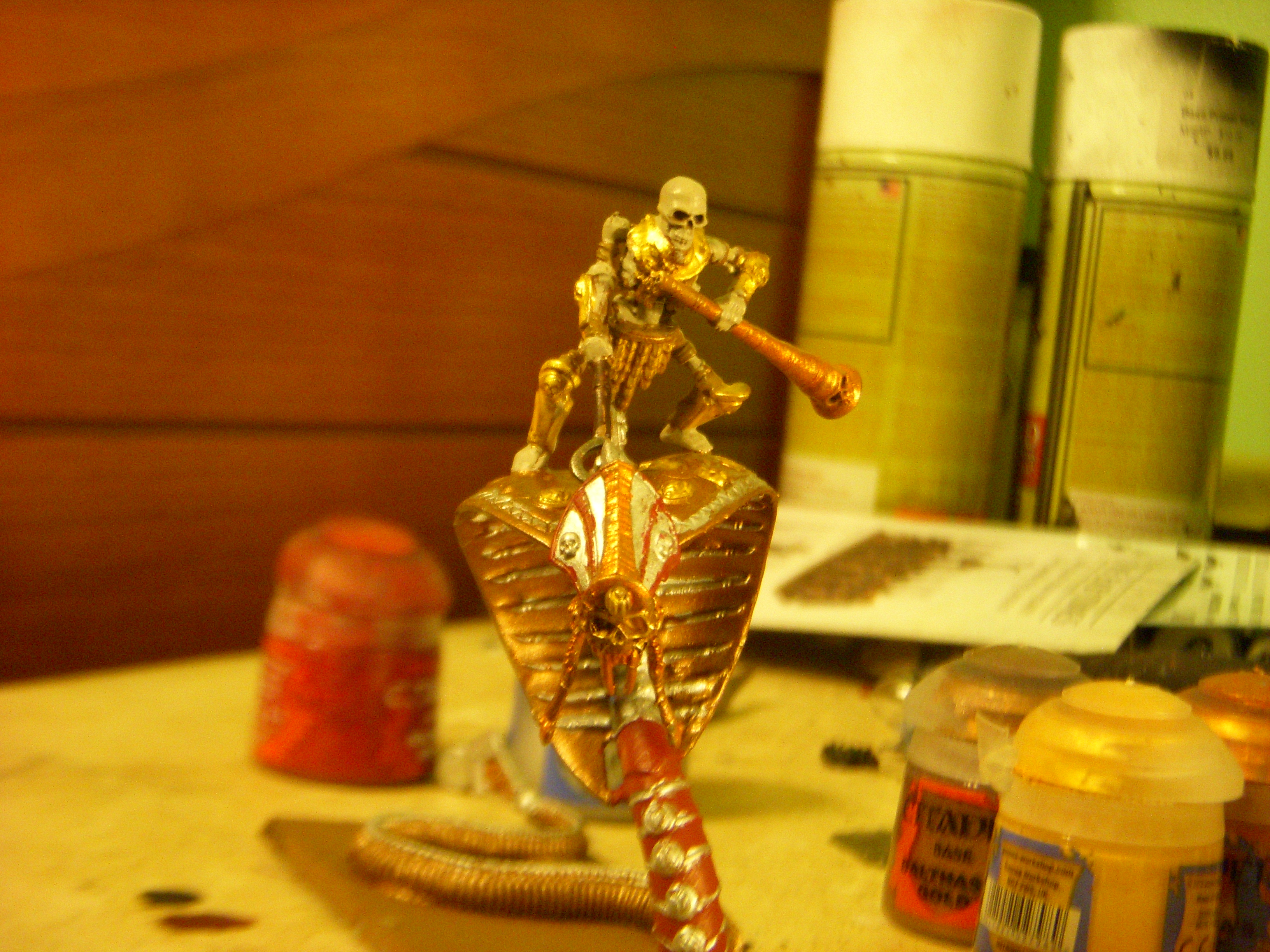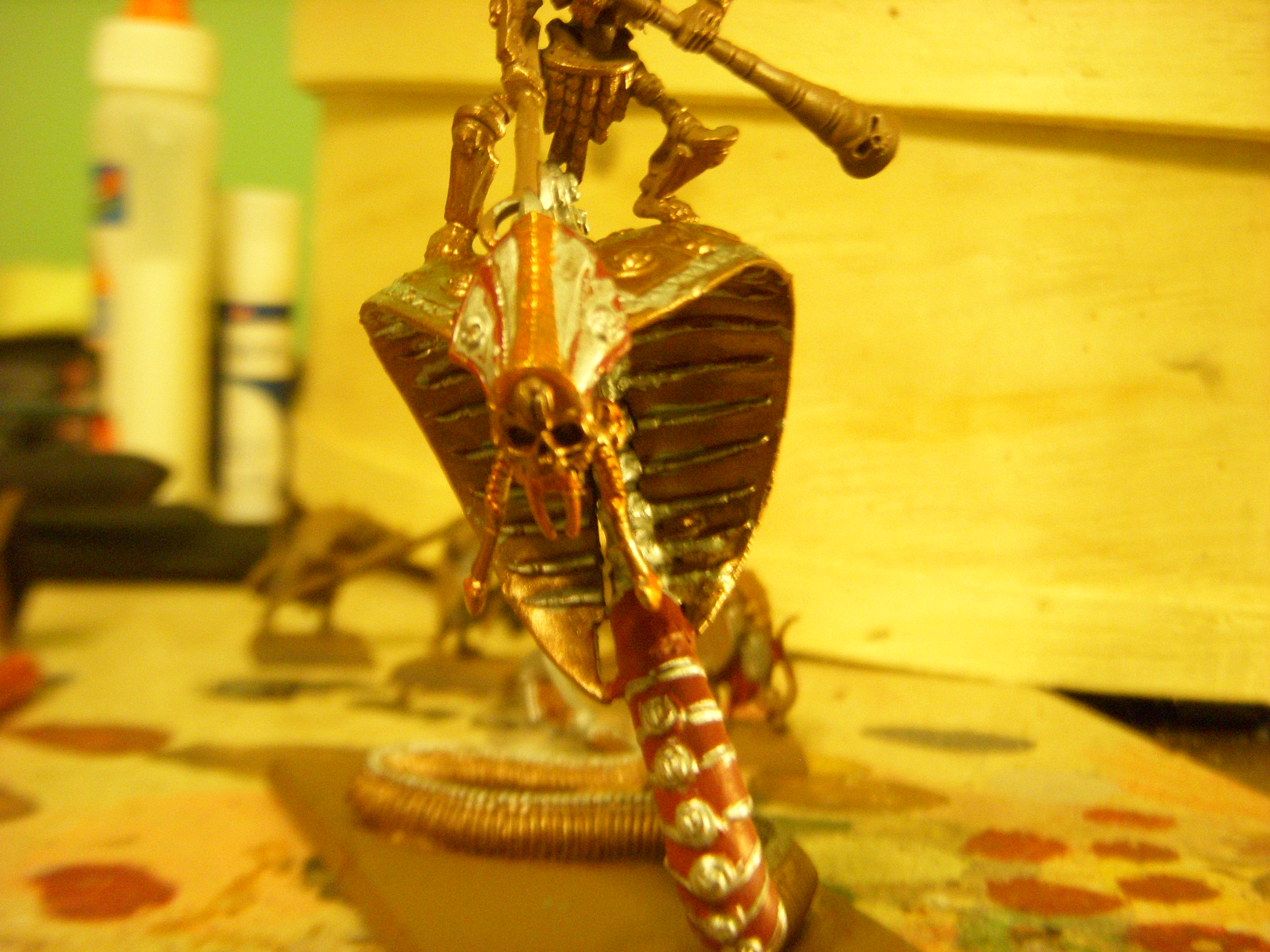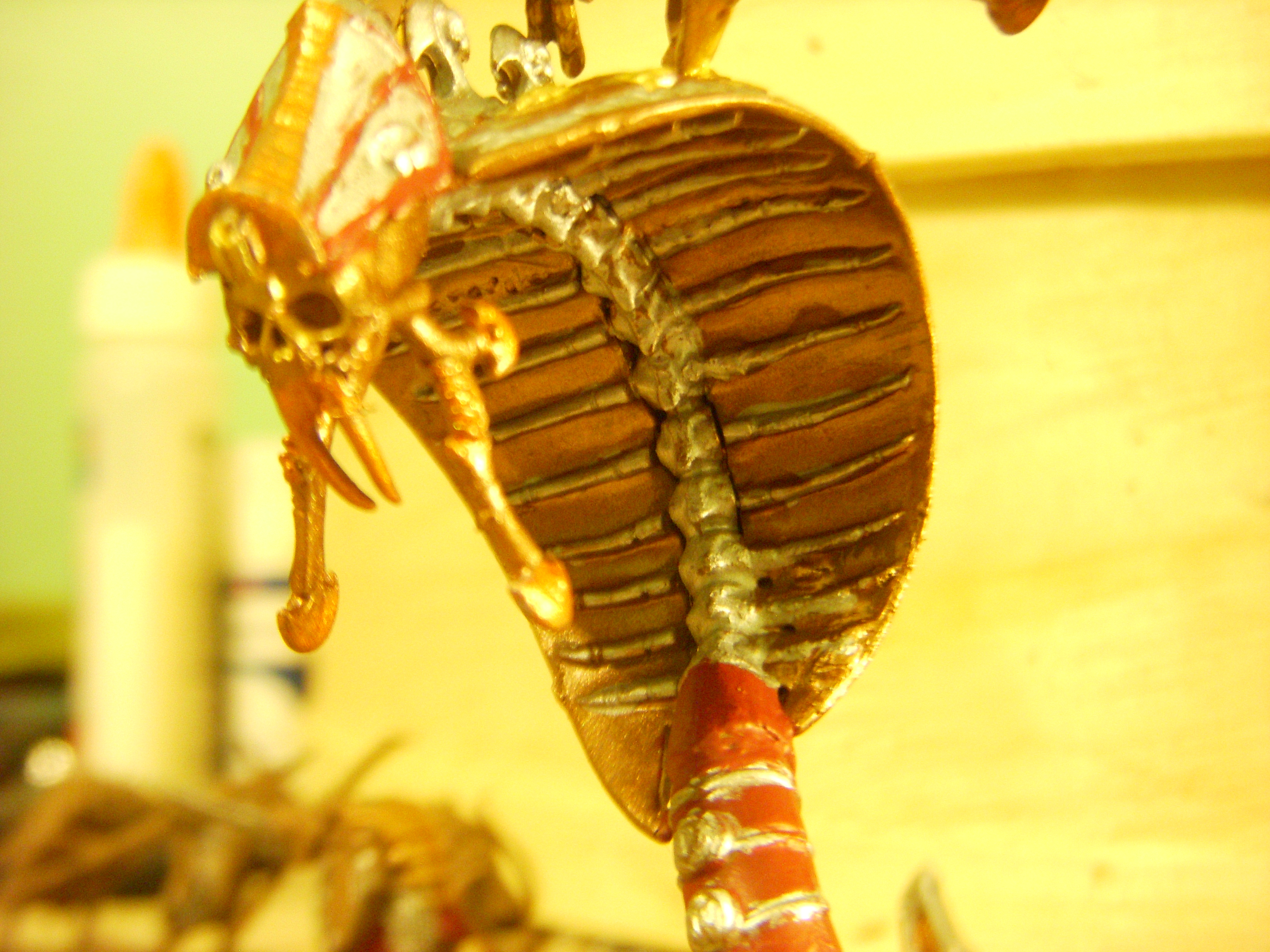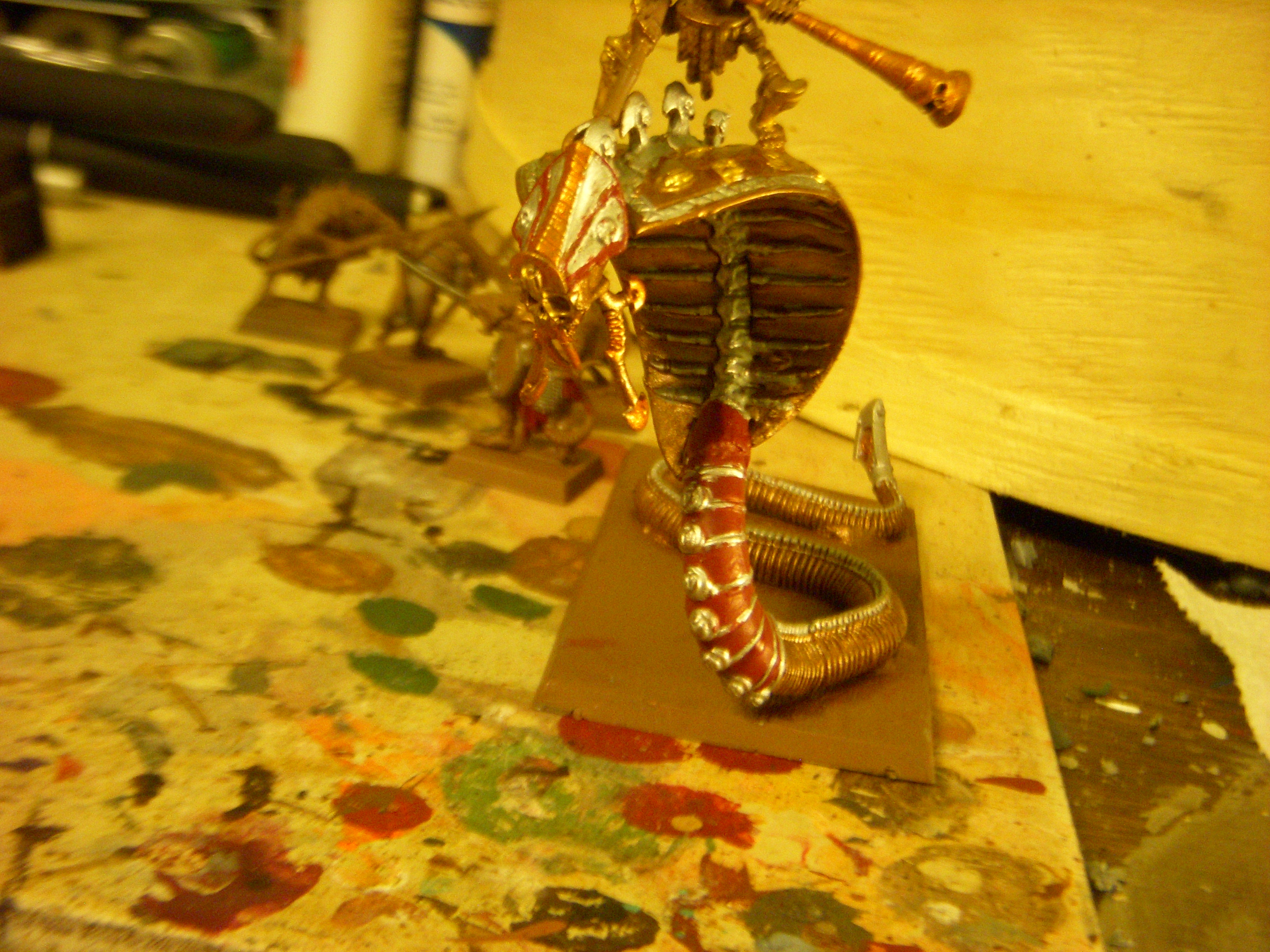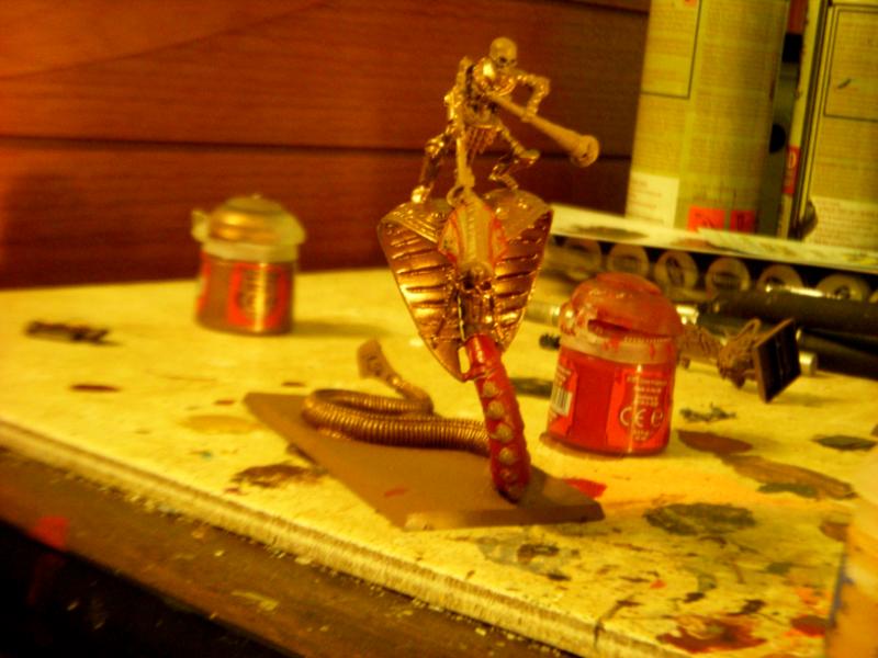 And the Necroserpent itself after the base coats in Khorne Red and Balthazzar gold. Going for the look of a statue you'd find outside the palace of a grand king, as such it'll be mostly gold and silver (Gold for the body and tail, Runefang steel spine details, Auric Armor Gold for the body details like the little carvings on its back.)