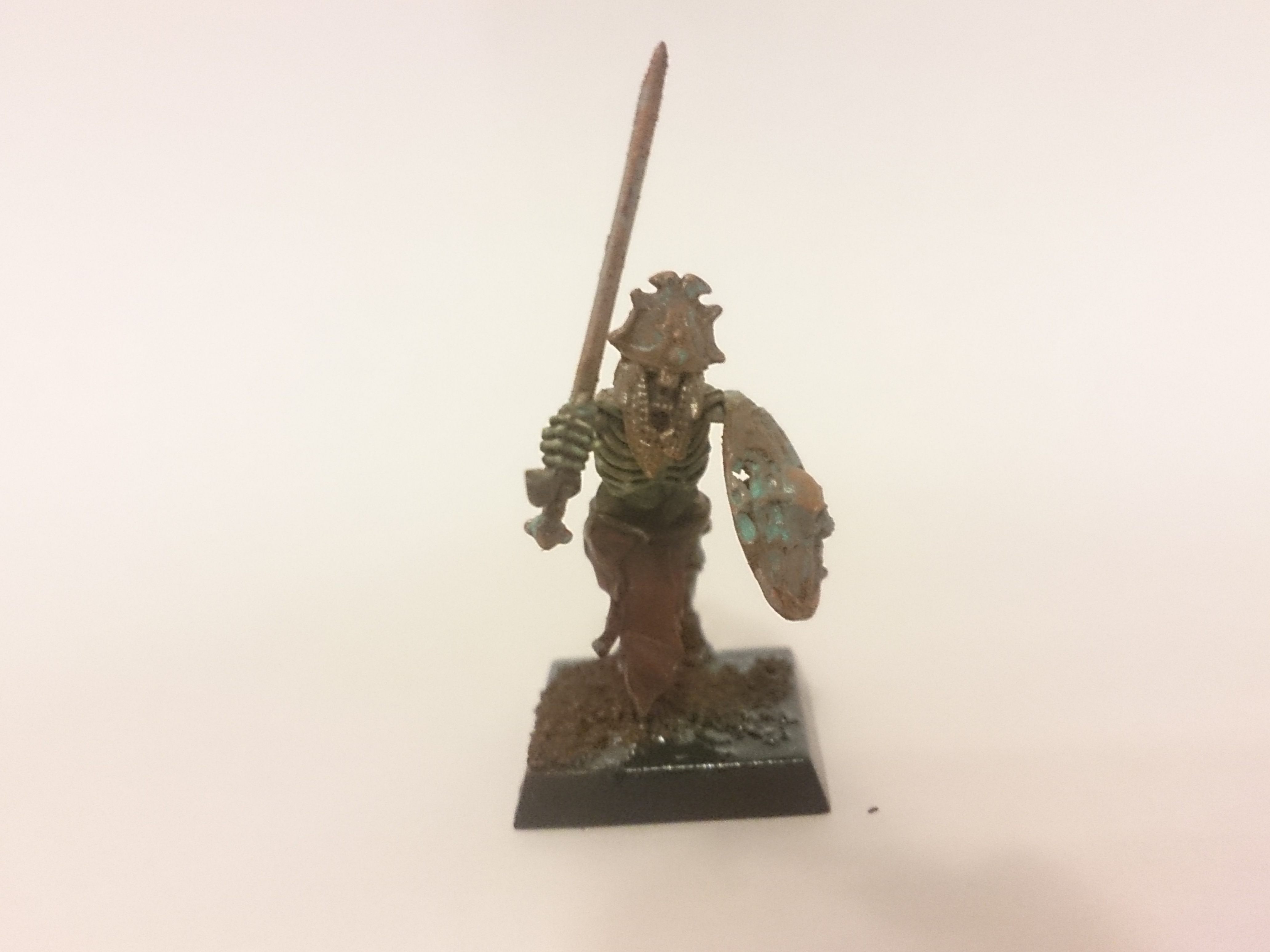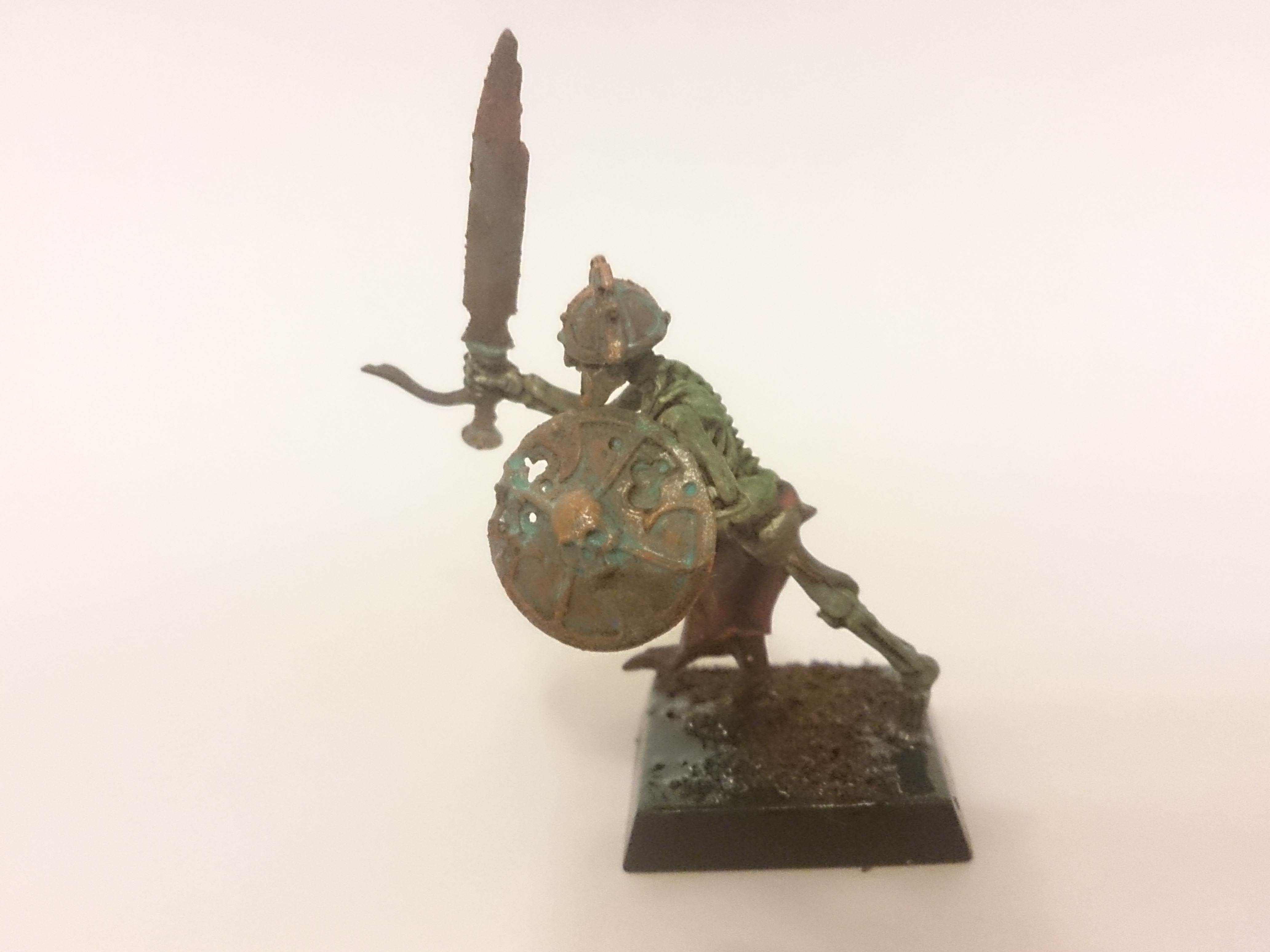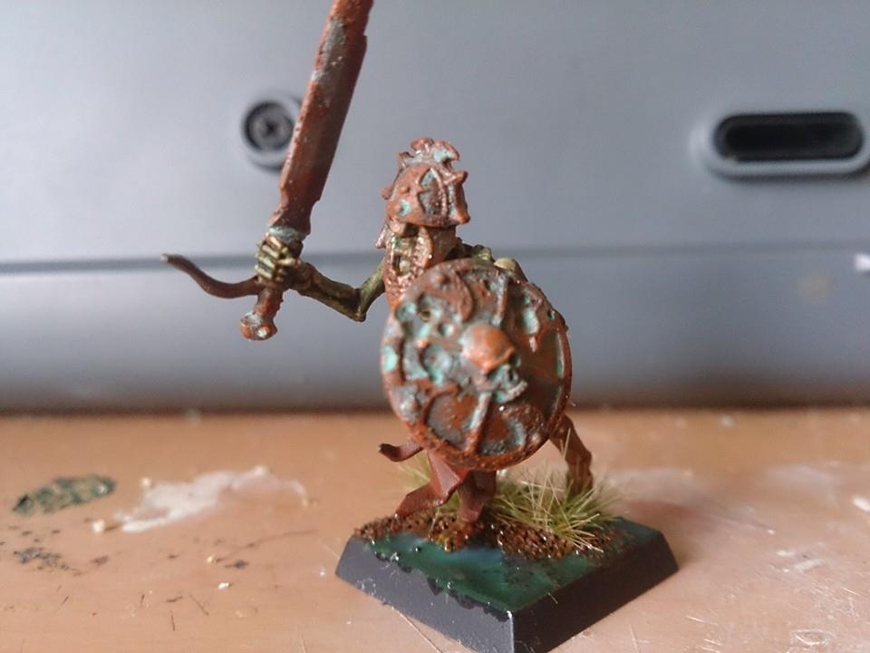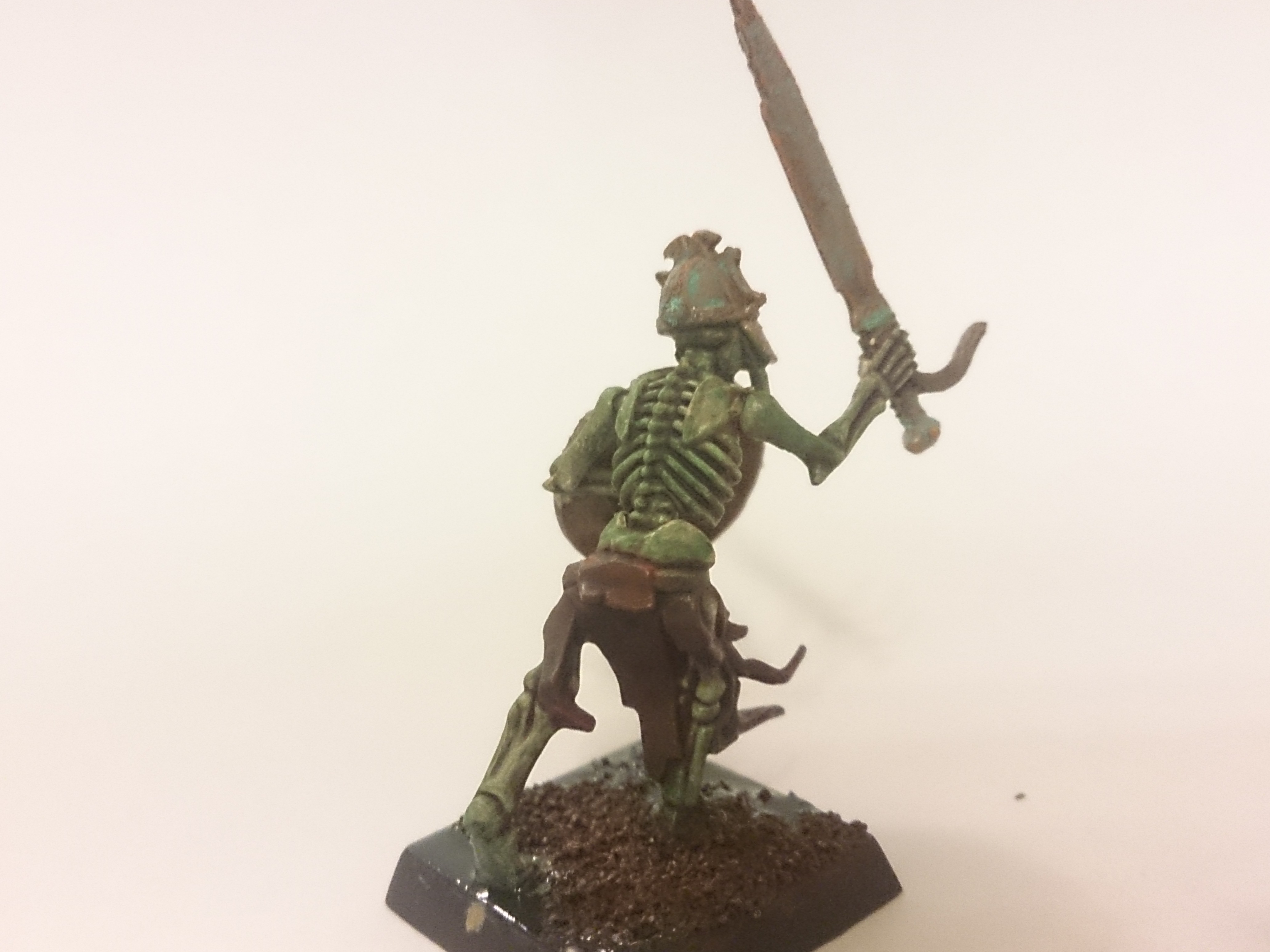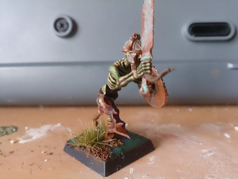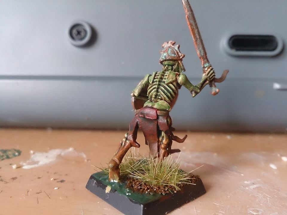 I really like, well, basically everything about this! The color of the bone is perfect, i love that blueish rust on the armor and sword, and the base looks very wet. There's just something about a well painted and based skeleton that never gets old.