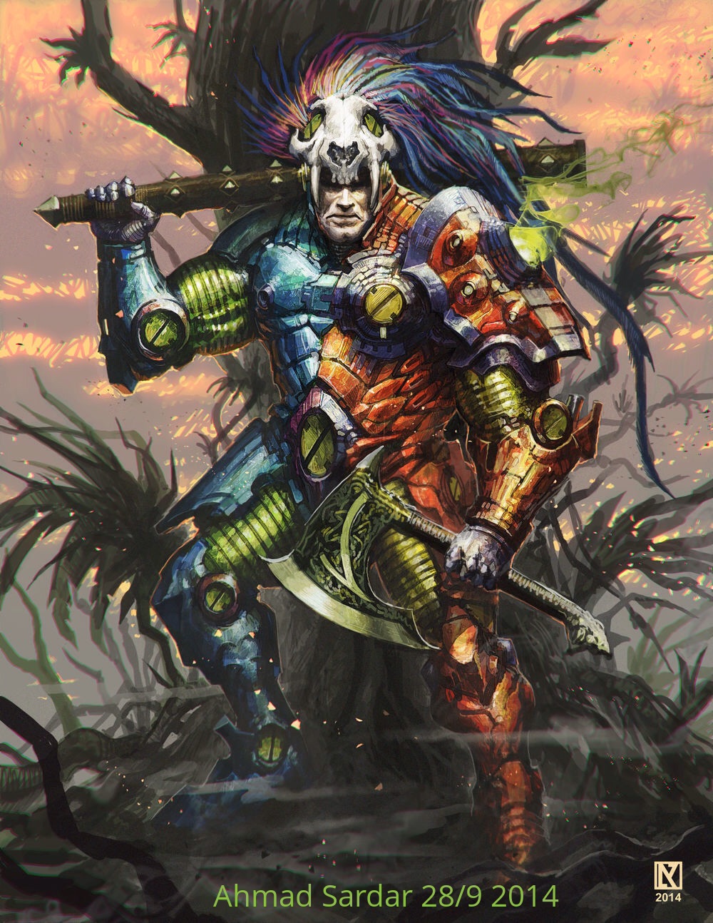 Hi guys im very knew to this site but Iam a big warhammer 40k fan and I have created my own lost Primarch and i have attached a picture of how he looks like. I based him as a aztec warrior type his name Monte Cazuma and his homeworld is Akbit which is a planet that is 20 times the seize of Terra and its a jungle world which has a nasty Ork infestation. The twist to this Primarch is that he has a split personality disporder ala Edward Norton in Fight Club where he thinks the voice in his head is the voice of the god of hunting A Tabai and his adoptive mother Zuma who found him when he was a baby is the High Priestess of the religion which worships A Tabai and because of that she belives that he is the prophet. His story is still a work in process but i wanted to share my creation with you guys. I commission this picture from a digital artist who had work for Games Workshop back in the days