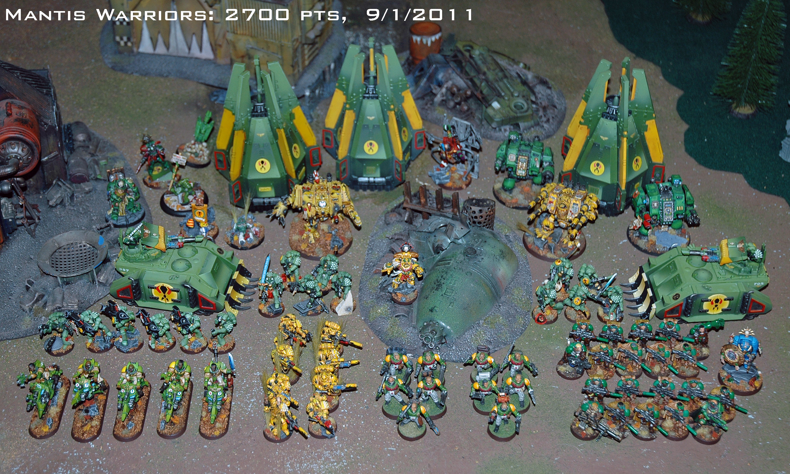 All right you lucky buggers... for those of you who have been long suffering and clamoring for a whole army shot... your time has FINALLY come! I actually have been thinking of adding my Mantis Warriors to the Army Profile section of dakka as kind of a short cut for those not interested in the process but who are interested in seeing the finished product... especially now that I have a cohesive 2700 pt army (though there is still more to do). So I took a decent picture of each squad and then one of everything assembled. When I get all the pics sorted out I'll begin work on the article. So, for your entertainment... I present you with my Mantis Warriors at 2700 pts (give or take, depending on war gear). I can field the whole thing in one shot minus one HQ as it all fits within the FOC, and the next two MW projects ( LS Storms and Attack Bikes) will still fit within the constraints of a single army. Since this represents my Badab era army, the only figure with Mk-7 armor is the chapter master (Pedro in the center there). Everything else is as original as I can get it. I also have not included my GMS squads are they are specific to my post-Crusade era army (which is largely still unformed). There are still plenty of other painted models, but they aren't painted up to my current standard so I've left them out for now. Hopefully, most will get stripped and re-painted so they can take their place amongst the brethren. The current army stands as follows: HQ: Chapter Master (counts-as Pedro Kantor) HQ: Terminator Librarian HQ: MoTF EL: Sternguard (8) w/ pod EL: Iron Clad Dread w/ pod EL: Venerable Rifleman Dread w/pod EL: Dread (assault cannon, CCW & HF) EL: Dread ( TL las cannon, CCW & HF) TP: Tac Squad (5) w/ las/ plas razorback TP: Tac Squad (5) w/ las/ plas razorback TP: Scout Sniper Squad (10) w/ Telion TP: Scout Sniper Squad (10) TP: Scout Assault Squad (5) TP: Scout Assault Squad (5) FA: Scout Bike Squad (5) HVY: Devastator Squad (6) w/ 4x ML Two of the dreads can be fielded as heavies if I take the MoTF, which is how I can bring the whole thing in under a single FOC. Sorry for the duplication, had to upload the photo as an attachment rather than as normal in order to avoid the auto-append function but then I can edit the image like normal. So I've added a normal image above the "attached" image which can be manipulated, viewed and voted on as normal. Below is the attached image... double click on it and you'll see it in a quite large format (or at least that's how it appears on my screen).
