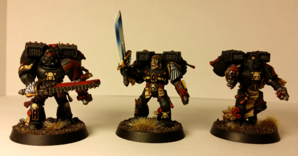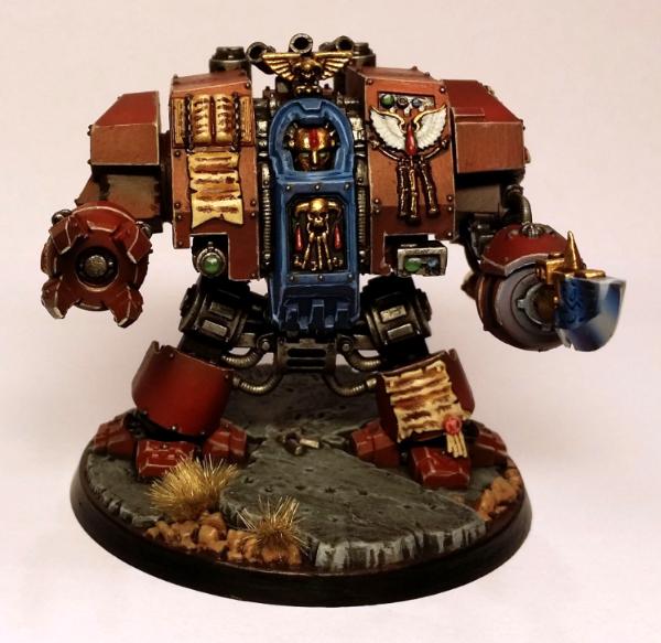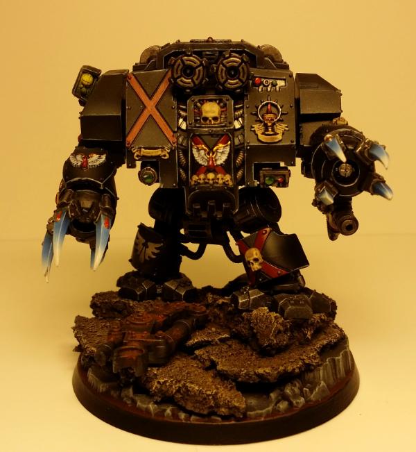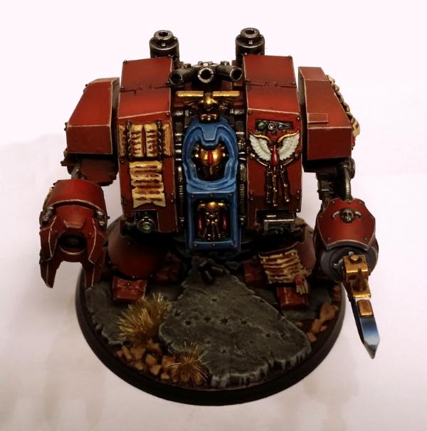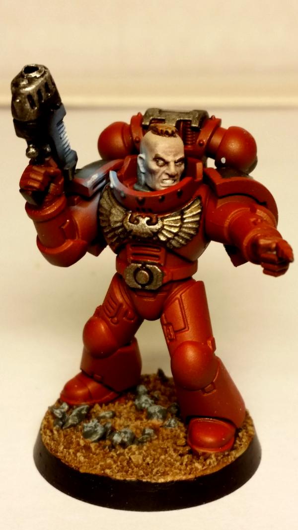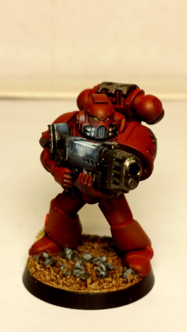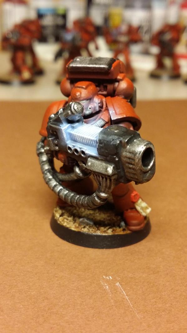 Very nice highlights here on the red. You probably can do a similar touch up on the Tacticals. I really like the Force weapon too--great technique there. The base, too, is excellent and really enhances the model.