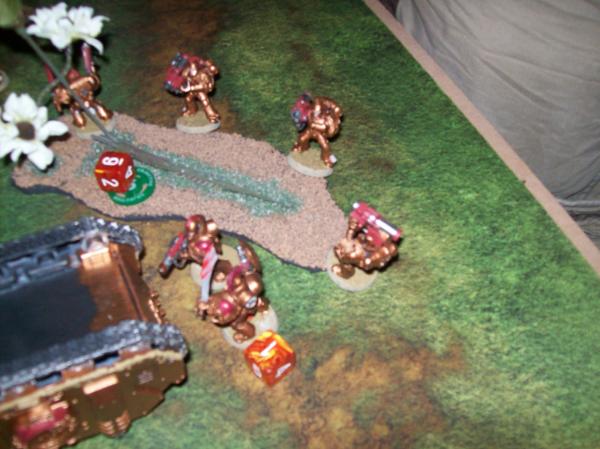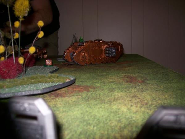 Missile Launchers all missed the Rhino (two had to move to get line of sight, so snap shot), so the Captain and crew went after it. However, I forgot about his Auspex until afterward, and the Melta shot would have gone through and Penned! Oh well, it was immobilized thanks to Grav Guns.
