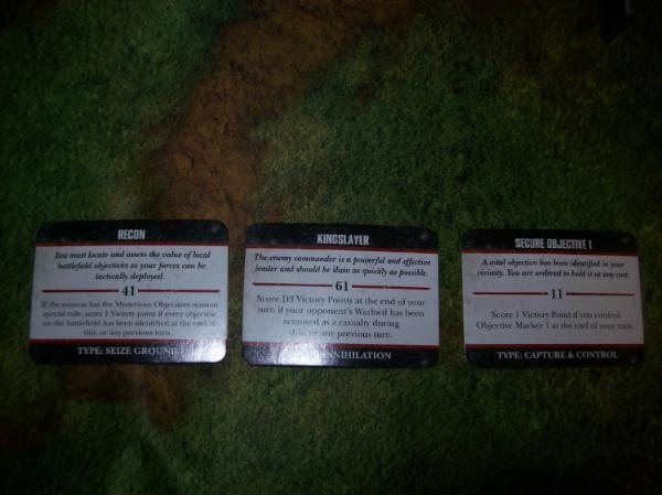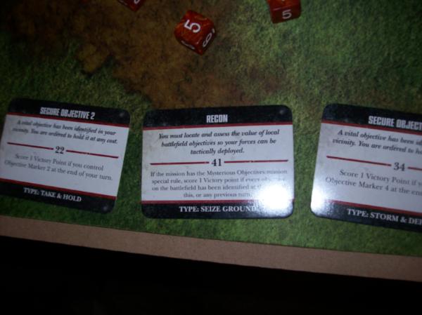 My turn 2 Objectives. I need 3 units in my deployment zone, which I have by default with my three Dev squads. I forget to roll for my Scouts.