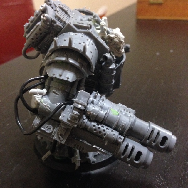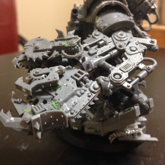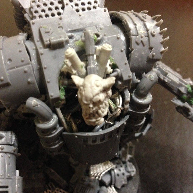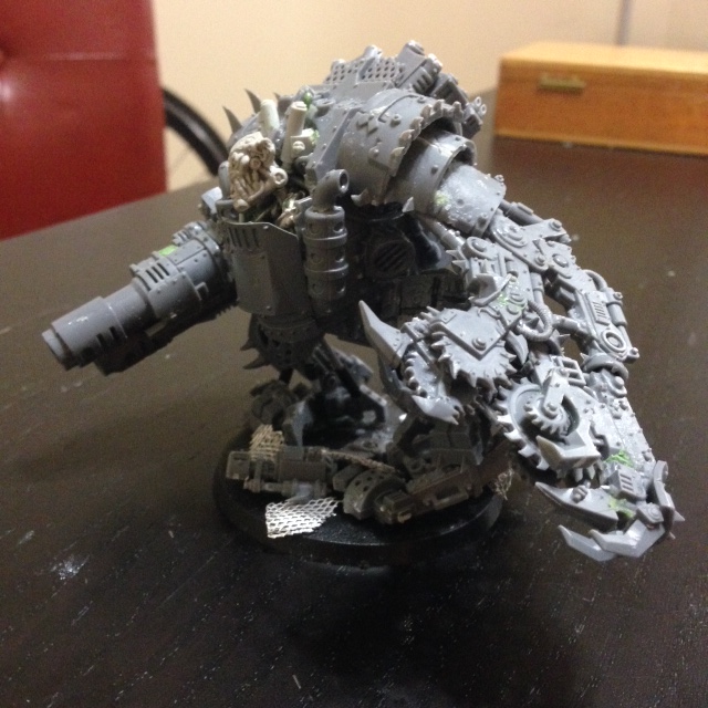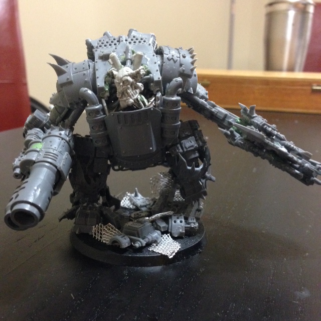 "This is the model I intend to use for Ghaz. I made it because what GW uses as Ghaz is some seriously soft s***. It's converted primarily from a Deffdread. I cut out the middle part of the torso to make room for the head area which I filled with various tubes and pipes made from pre-existing bits/pieces and paper clips. I also cut the right leg at the middle to extend it in a more up-right position. The rest of the model essentially consists of pieces from the Leman Russ, Dakkajet, Warbikes and Nobz kits. Need to do a few modeling touch-ups before I spray it, primarily to the vents and tubes on the back. The set-up that comes with the dread is too over the top for my taste (I know, it's Orks), but as-is for how I have it is pretty weak. My other warbosses have a common motif of chains draping off their upper-body areas so may decide to include that as well with chains draping out of the shoulder pads."