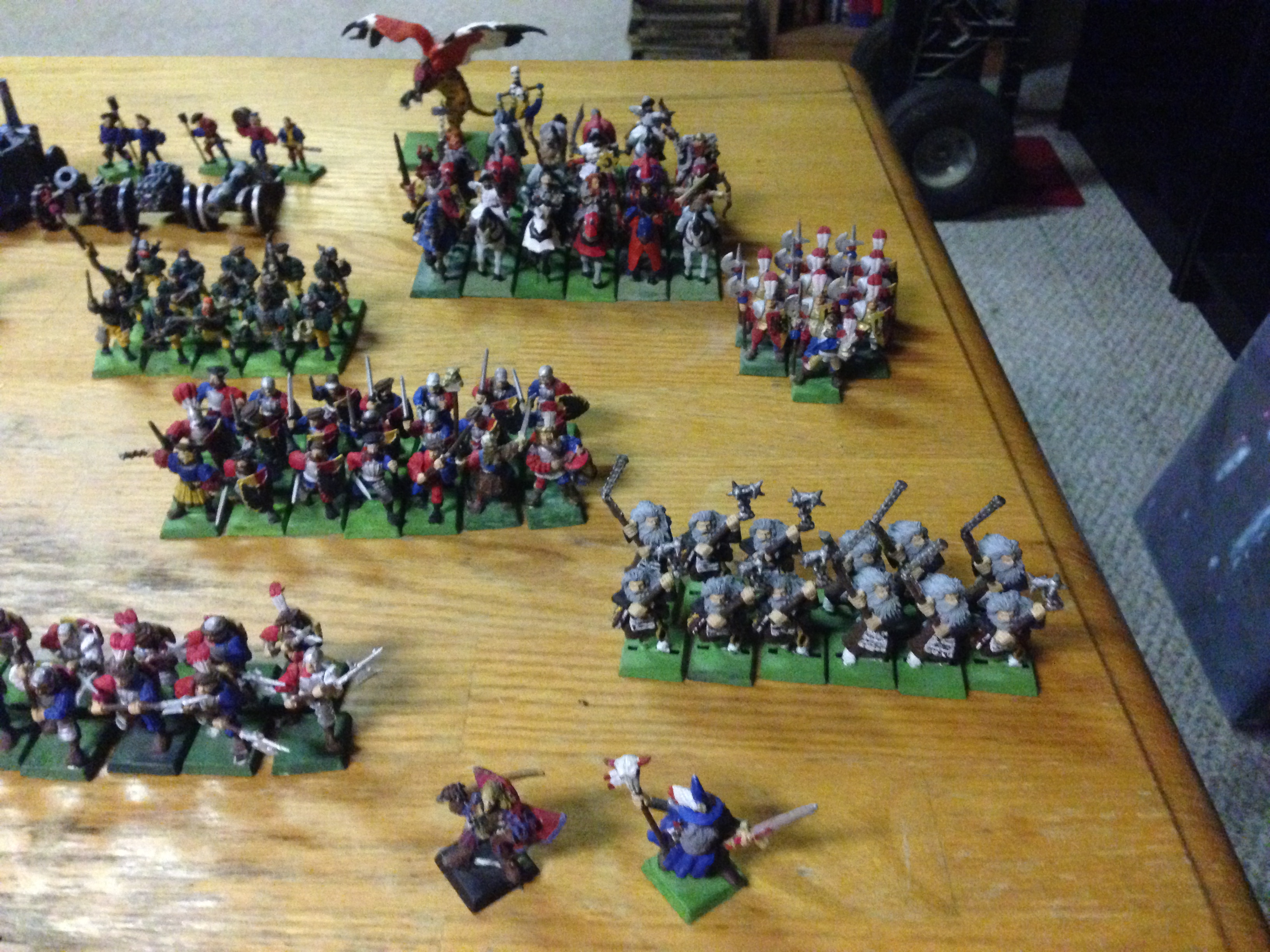 This is my first time in the WH fantasy section, nice place you guys got here! Anyways down to business. I got a buddy who got a bunch of WH Fantasy miniatures from one of his friends to play with my group. Sadly we all play 40K and not fantasy. So now my buddy has got an Empire army and Lizardman army he can't use. Since I'm a veteran of 40K he handed the models to me to try to sell for him so he can buy a Dark angels army. My knowledge on all things Fantasy here is rather...limited, so I was hoping you guys could help me out in finding a fair price to ask for these armies. I'll post the pics I took below and hopefully they are of a good enough quality to be able to appraise them. I have a box of bits that came with the armies that looks to have all the pieces necessary to fix some of the models that are missing arms and weapons and such. Thank you in advance ladies and gentlemen for all your help!