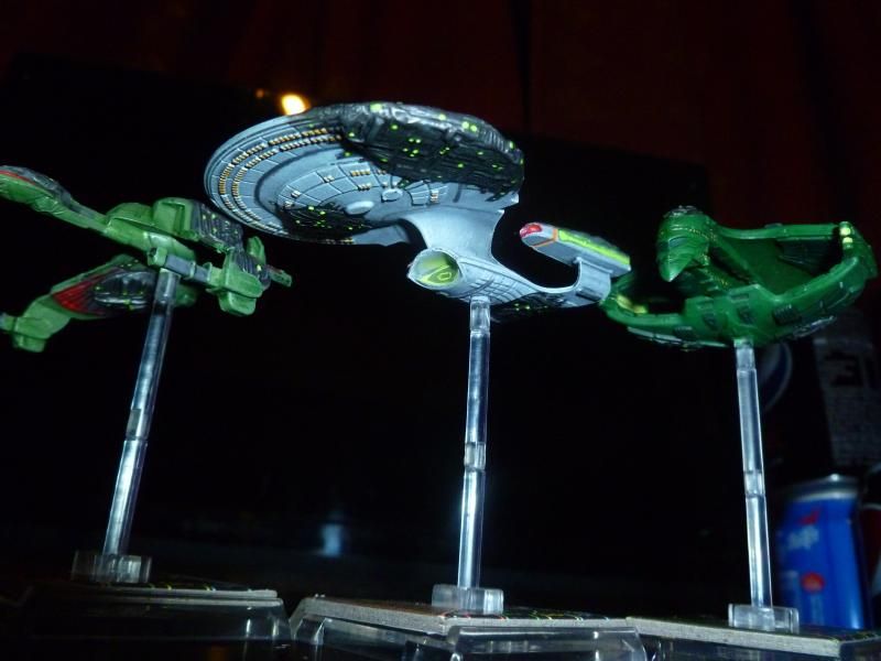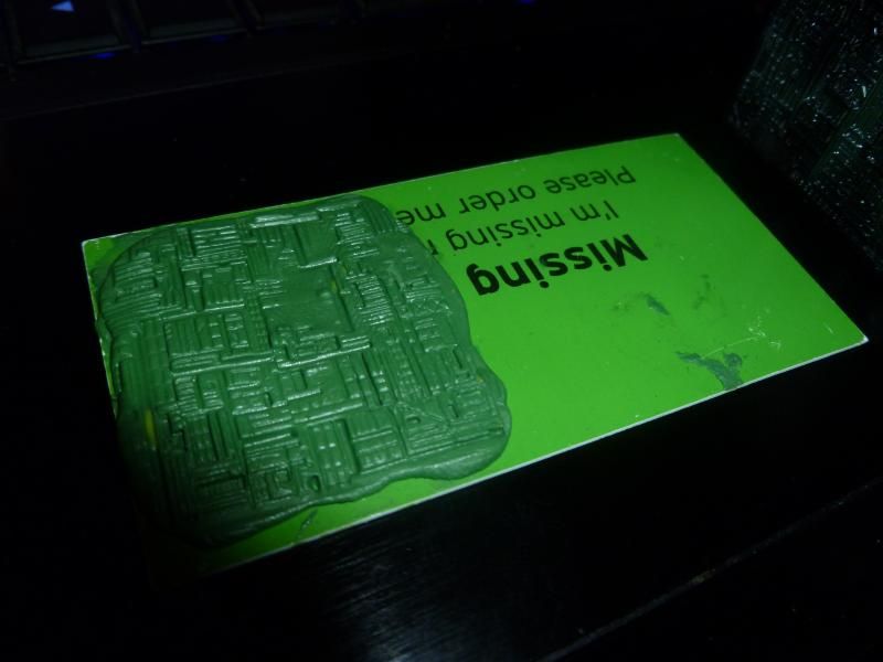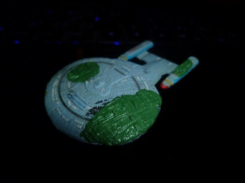If i'm honest, i think my first test from those pictures turned out better than most of the other ships. On ATP and the bird of prey, for some reason, the green stuff just didn't spread as far with the stamp as it should have, so they look like 'blobs' of borg stuff sitting on the ships, whereas on the Avatar of Tomed and 'practice' Assimilation Target Prime it ended up blending into the hulls much better and more naturally. But oh well, green stuff is a cruel mistress when your out of practice...