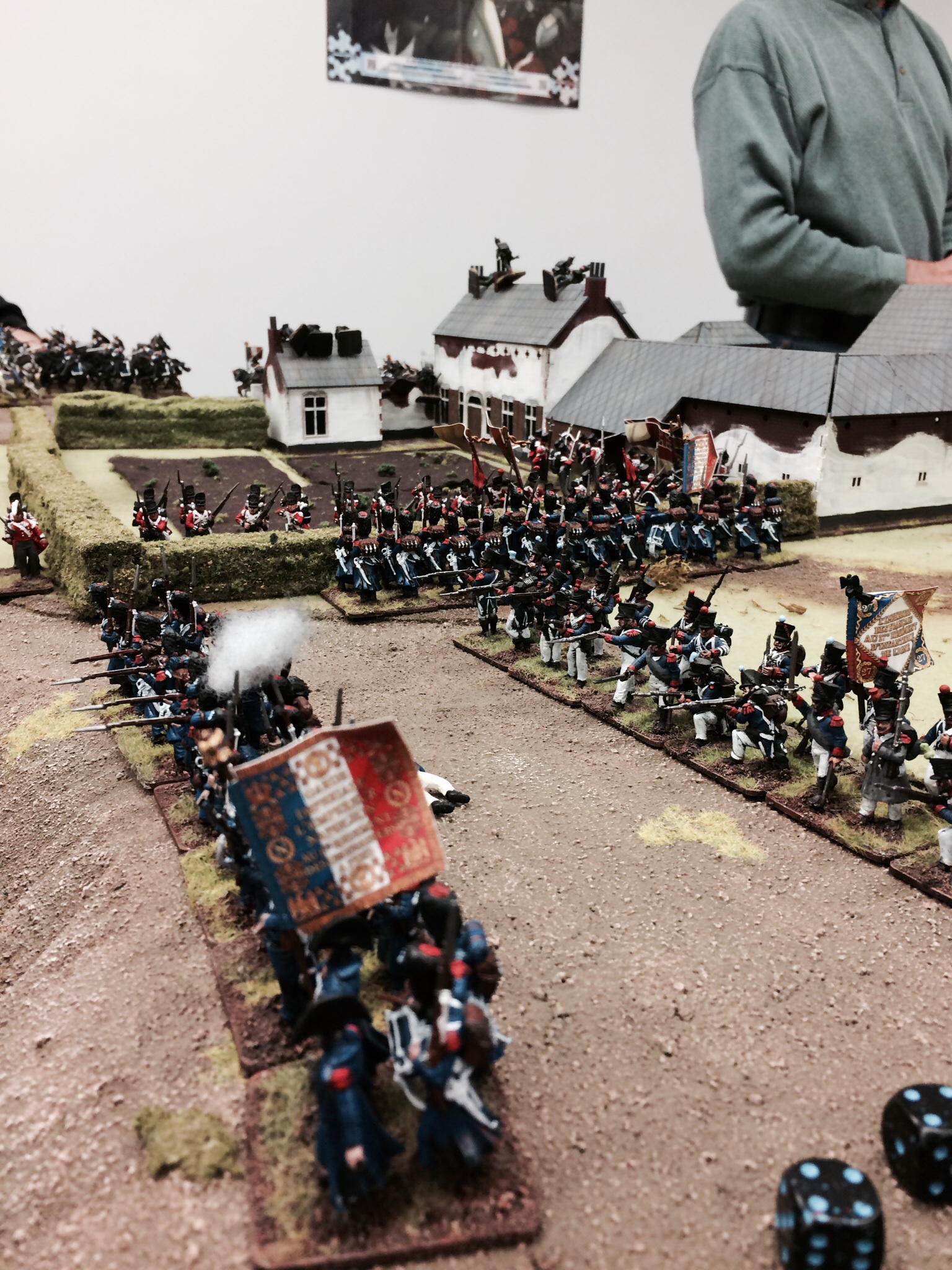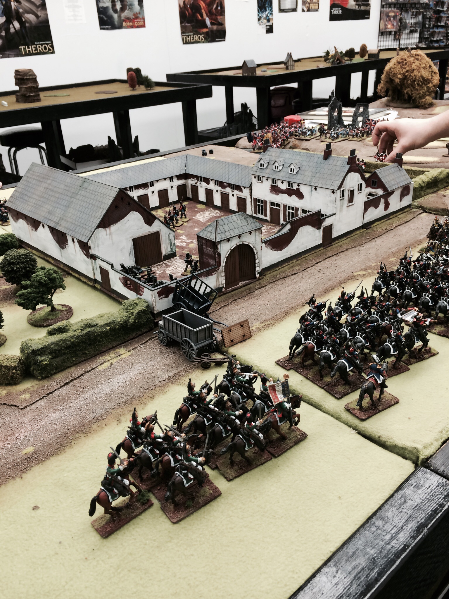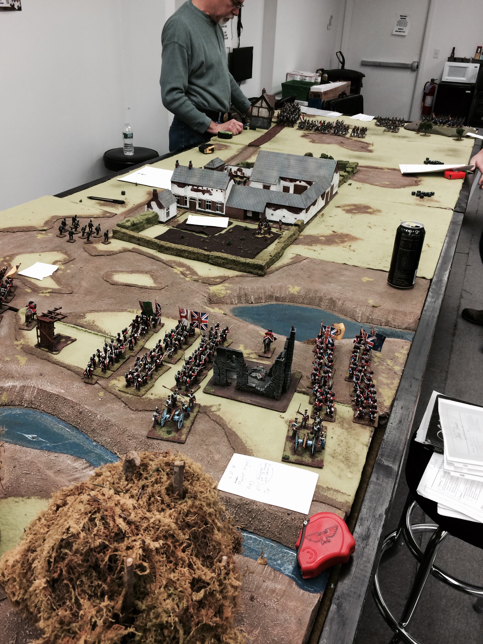 The Saturday before Christmas I planned my big holiday game of black powder . Me and a couple of friends met at one of our local hobby stores . The war store hobbies center in Riverhead NY . Great store with some good table space . They held two tables for us . I arrived and began to set up everything I owned in 28mm napoleonics . I set the la haye sainte farm house in the center of the board , along with it's defenders . loosely based on historical forces that occupied the farm . Everything else was orginized in to two brigades about the same in strength . The game kicked off with the French cavalry racing up the right flank bypassing the farm house . The other French brigade began to move up the left flank with two battalions trying to assault the farm . Which ended up being a fail . They got hung up in the farms orchad just out side the farms outer wall . As the kings german legion rifles fired into them . The command roll to order a British brigade was a failure . The British colonel was a complete Buffon . Barely ordering his men terrified of the French old guard marching on them . Of course this was my commander and brigade . The whole game I yelled and ridaculed him and threatened to never play a game with again . The French had the same problem with a whole brigade ignoring there orders as well . Playing a big part in why the French couldn't put a full push on the farm house . The French heavy cavalry smashed into the brave British light cavalry . They kept battling in a furious clash of sabers . Finally the the British succumbed . But with the rifle and musket fire from the kings german legion and the 95th rifles they'd were able to rout the remnants of the French heavy cavalry . The end of the of the battle showed the French army was unable to take the farm . The British were bloodied , but were able to hang on . Inflicting damaged to stop the French , for a British victory . great game with lots of fun moments . Can't wait to play again . Enjoy the pics . Till next time . Hope everyone has a great holiday season and a happy new year . So much more gaming ahead in 2015 !!