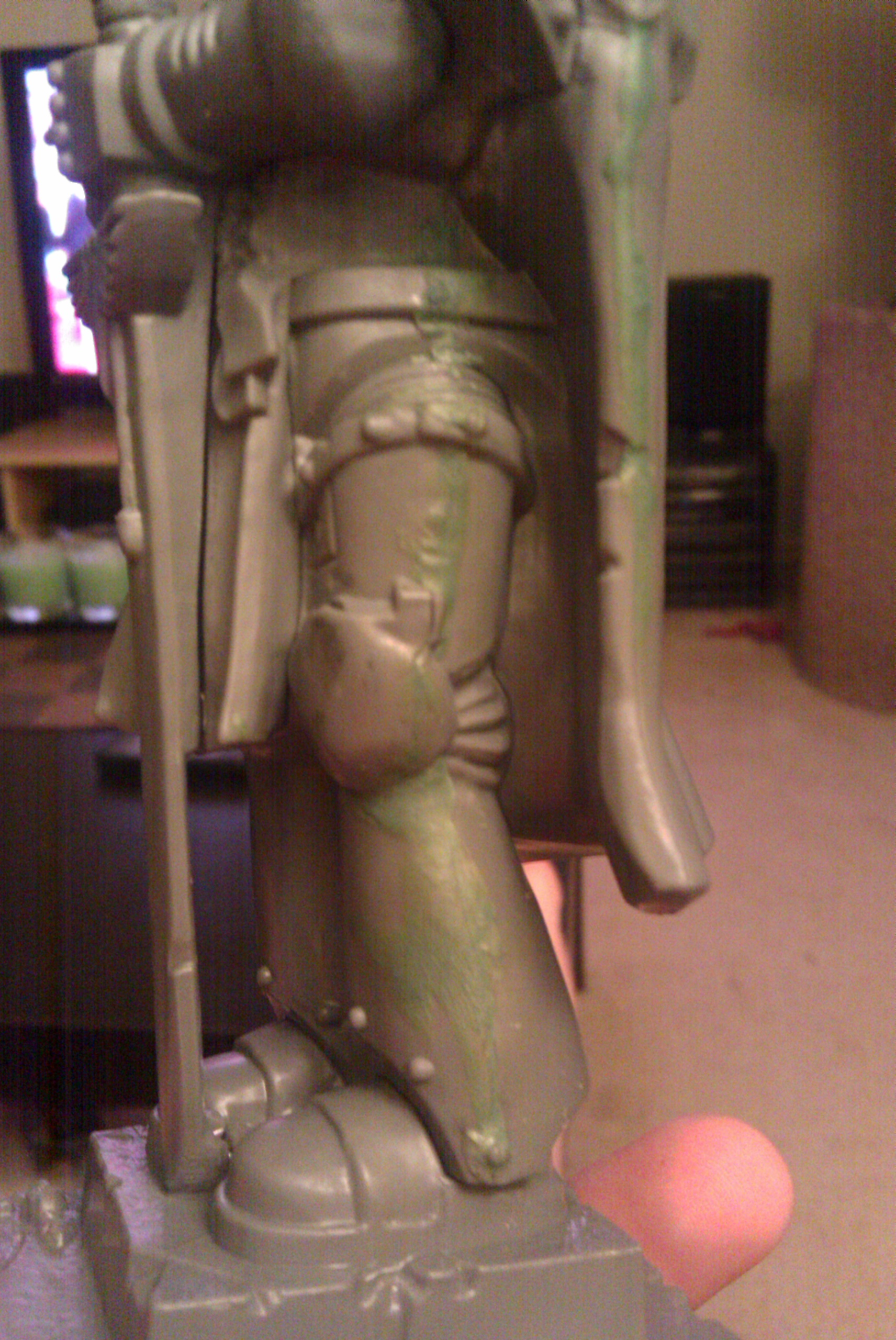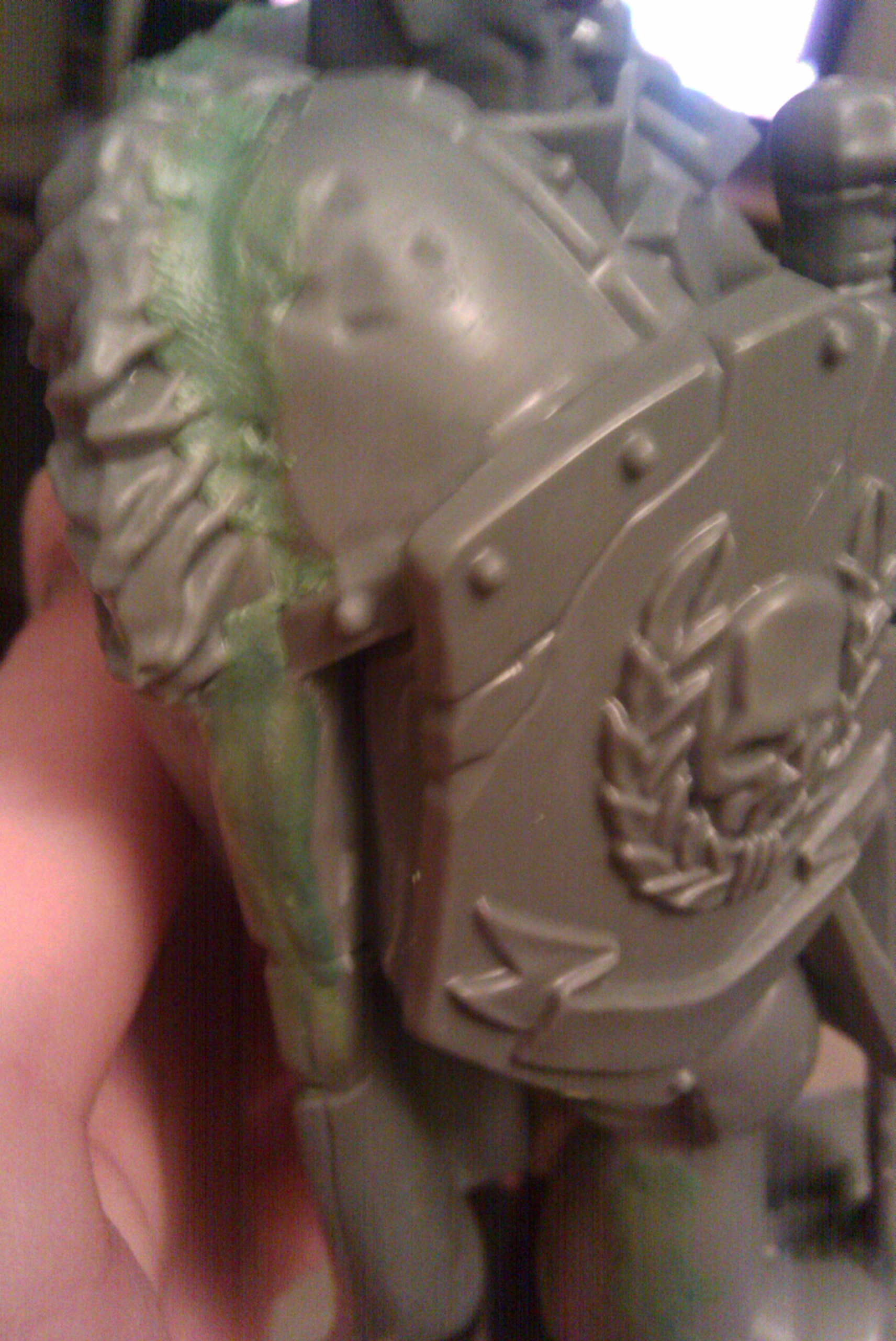 I could go for a copper or bronze, though the cracks on the shield lend more of a stone-like appearance, unless you gs those over. You could conceivably make some sort of granite or marble look with him, which would also work, given the symbolic purity inherent in Spess Mahreens!