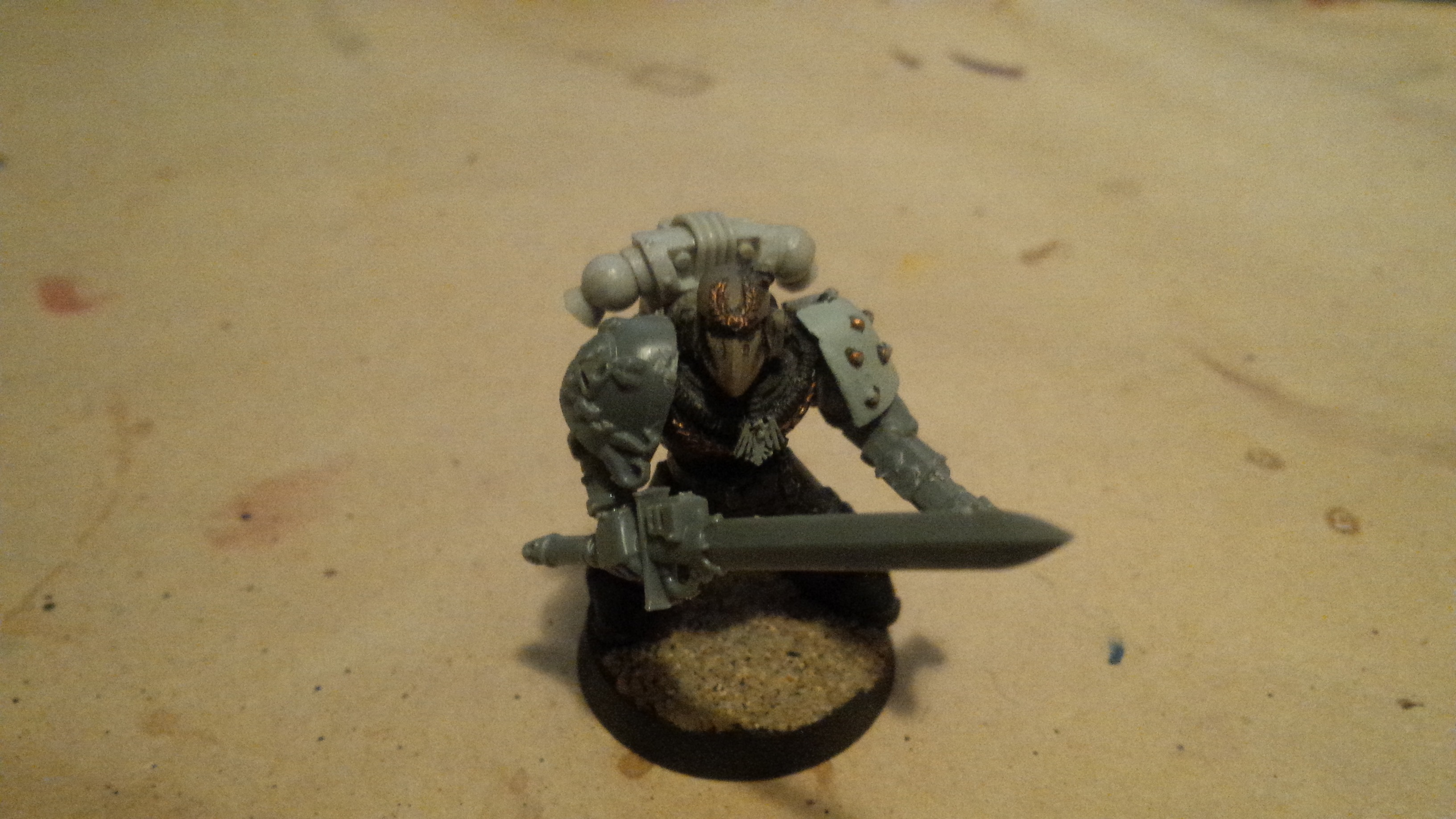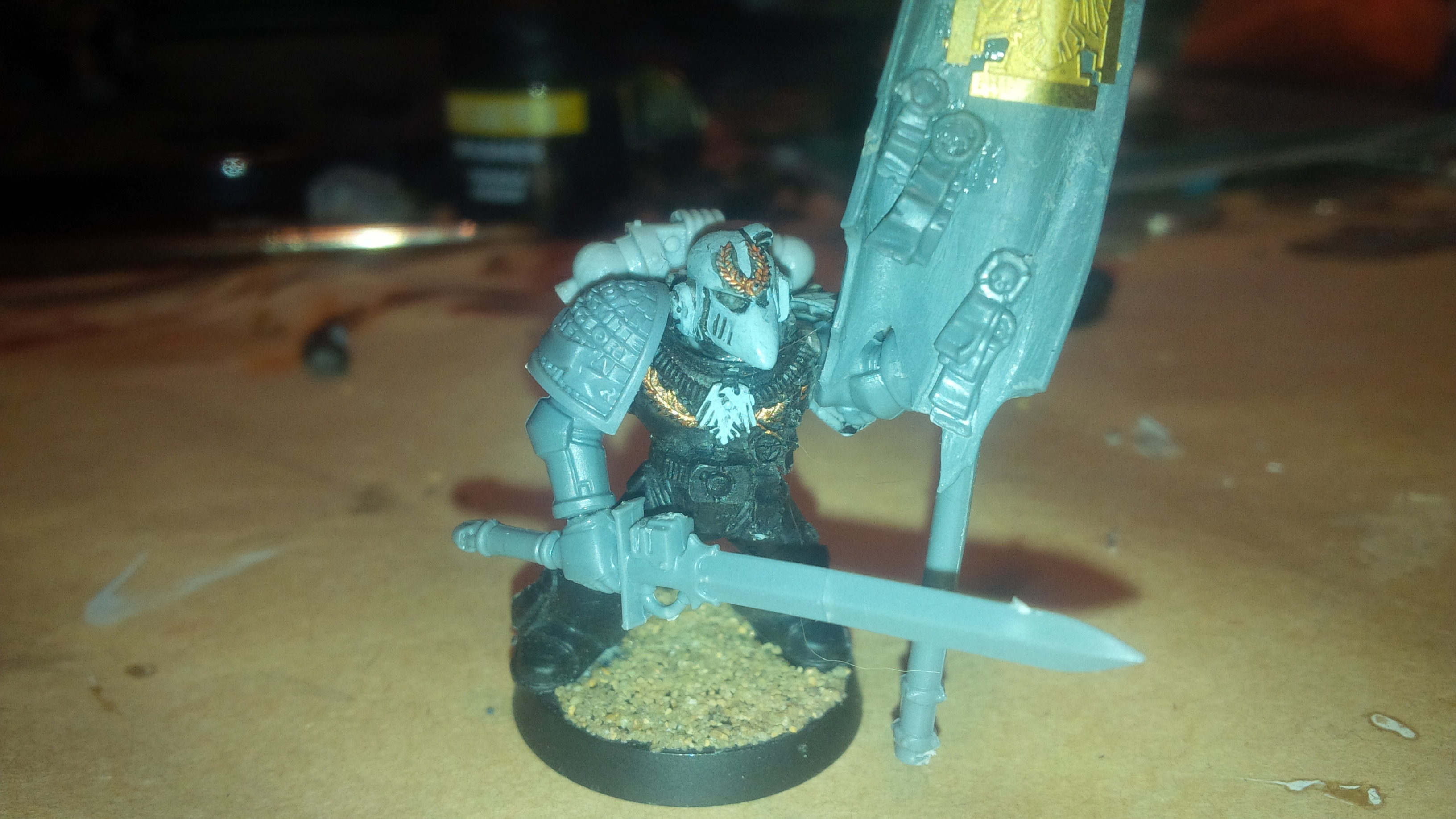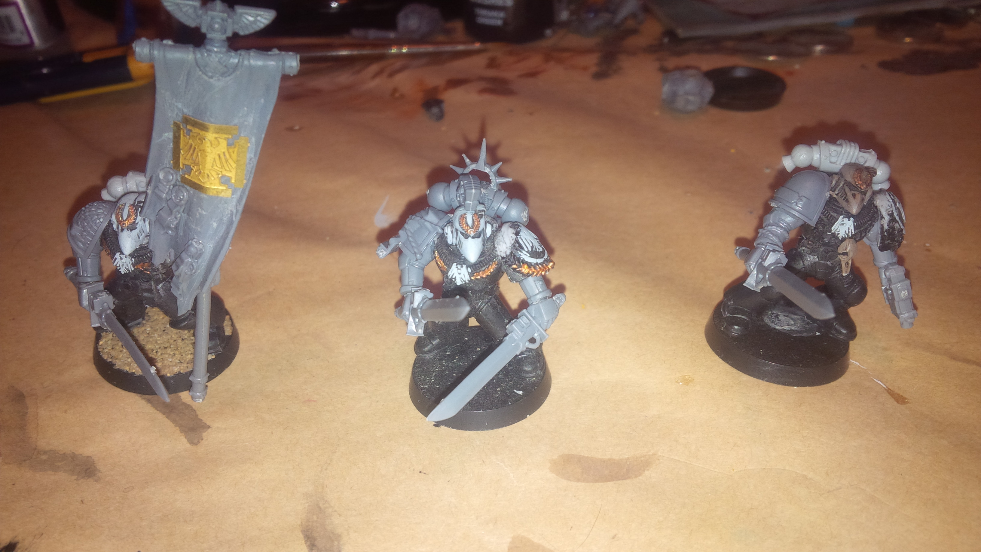 I've started with three; I used the big swords from the grey knight kit to count as power axes/relic blades, the falchion is just the extra close combat weapon in game. the banner is from the warrior of chaos box. The champion's backpack is a death company one with the blood iconography removed