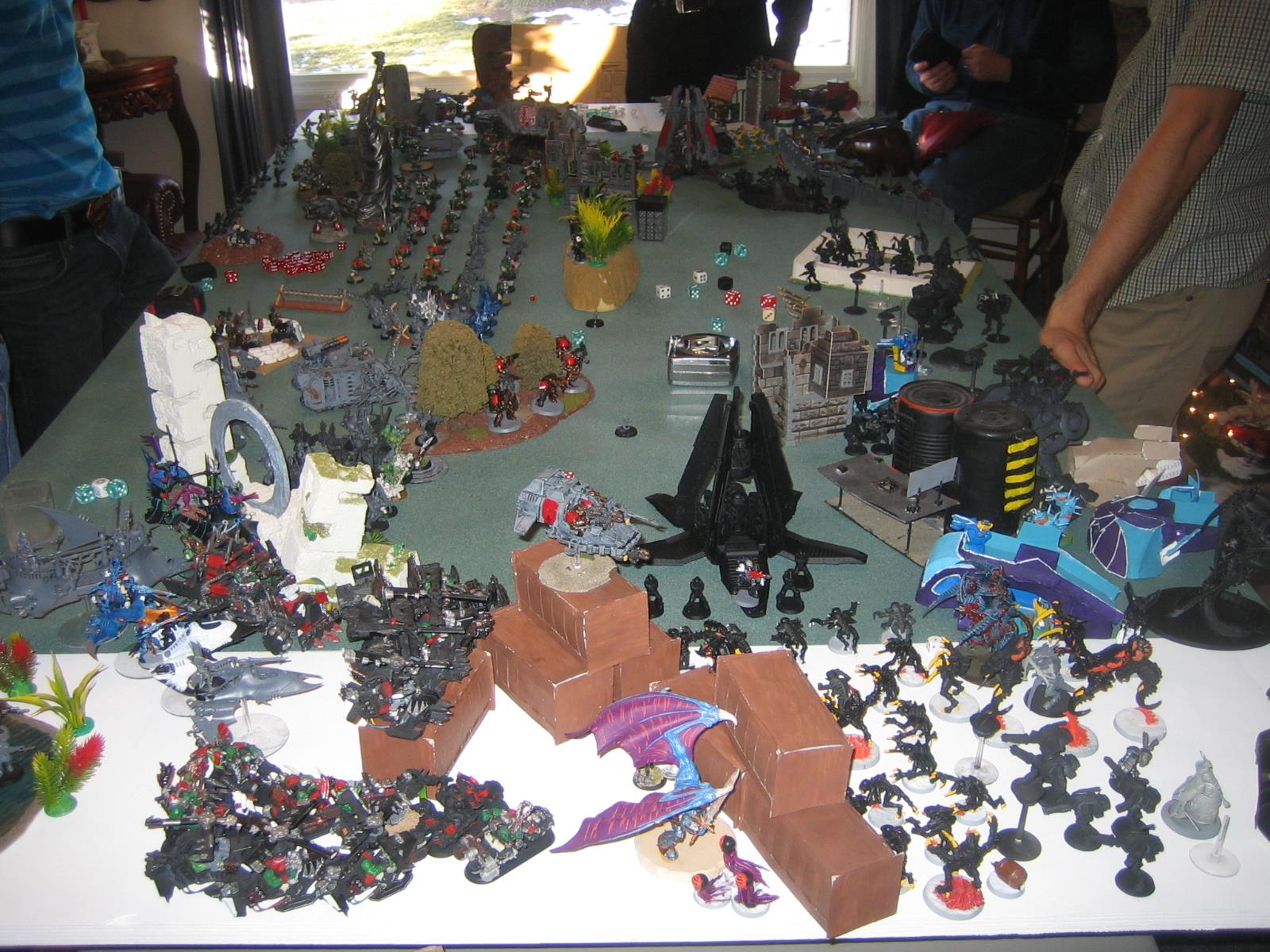 20,000 points on a 10 foot by 10 foot table. 5 players per side. The store's Tyranid Players versus Space Marines, Imperial Guard, and an Eldar Player. The Imperial Side won by rolling up the left flank and then pinching the right flank and center.