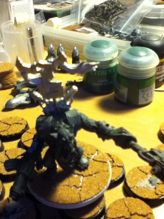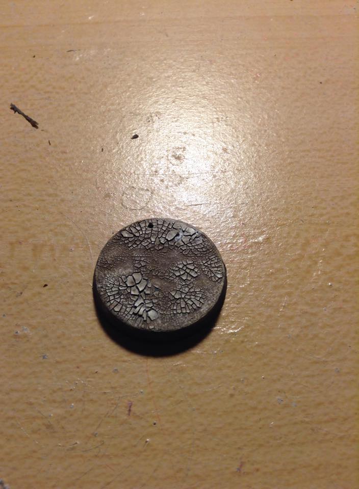 Not much of an update...I've been at work so I couldn't work from home the past 3 days and work on anything...but I have a test base to show you! now it's not undercoated at all...so the black is there...I mostly wanted to try out that agrellan earth paint...and it's amazing!...I drybrushed with 2 different colors of bone white..the lighter color just focused on the cracked areas, and I used a thin coat of devlan mud on it to tie it all in....the drilled hole was another small test to see if the surrounding paint would flake away from the drilling...an no flaking! such an amazing paint
